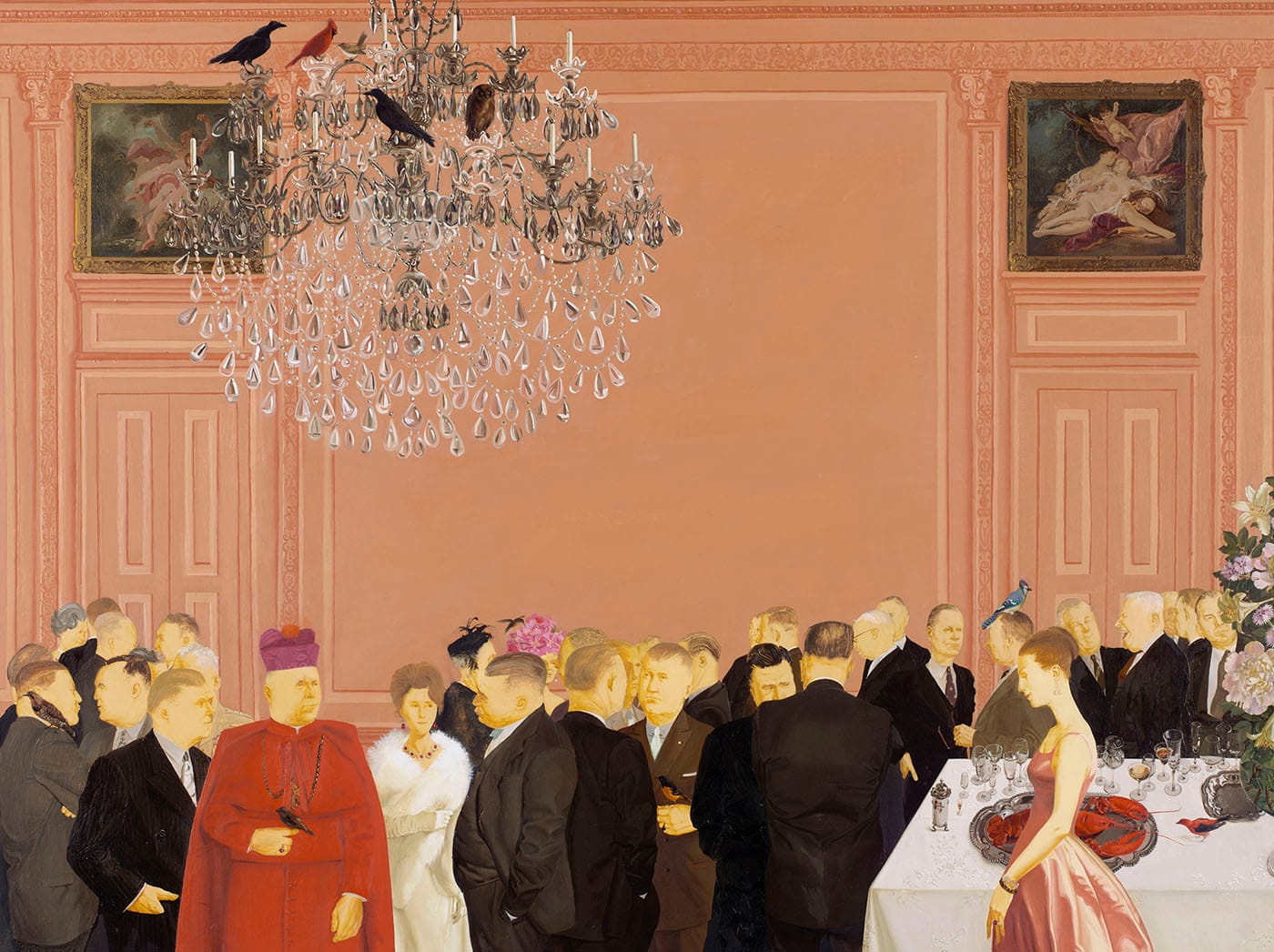 “Reception” (1958) features François Boucher’s “Jupiter in the Guise of Diana, and the Nymph Callisto” and a second, more obscured image, both of which show mythical rape scenes as they hang high on salmon-colored walls above a lavish gathering. The work represents Sharrer’s transition from celebrating the life of the common worker to exposing the abuses of the rich and politically powerful. Those milling around the reception include US Senator Joseph McCarthy — whose political machinations were directly responsible for Sharrer’s exile — FBI Director J. Edgar Hoover, and Cardinal Francis Spellman. Opposite Spellman is the only other figure in colorful attire, who’s also located on the same foreground plane as him: a young woman in a pink ball gown with a reflective attitude. Separated from the rest of the reception by a banquet table, this figure seems to be a likely stand-in for the artist, who at that point in her career was already experiencing the alienation to which most confrontational women can relate.