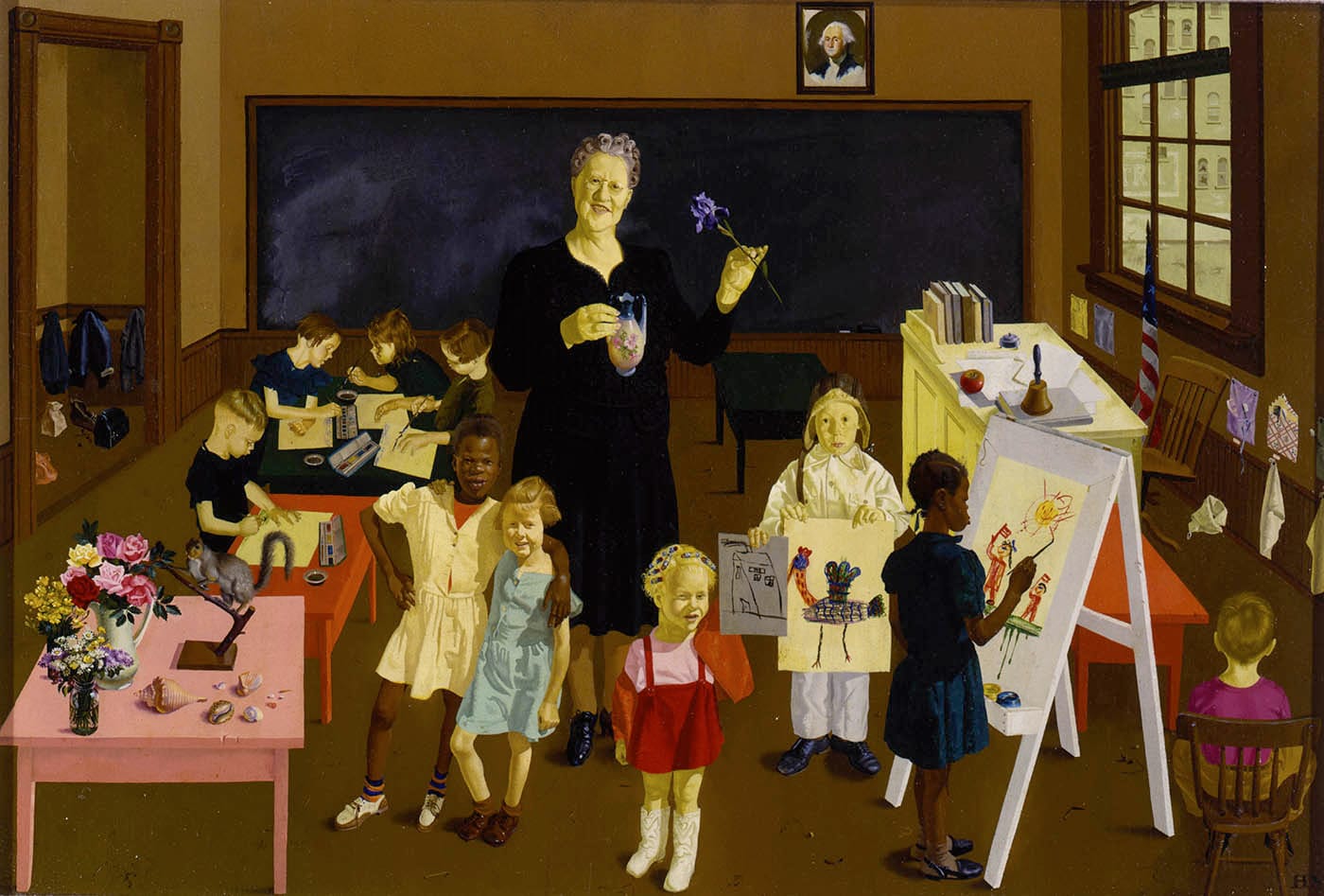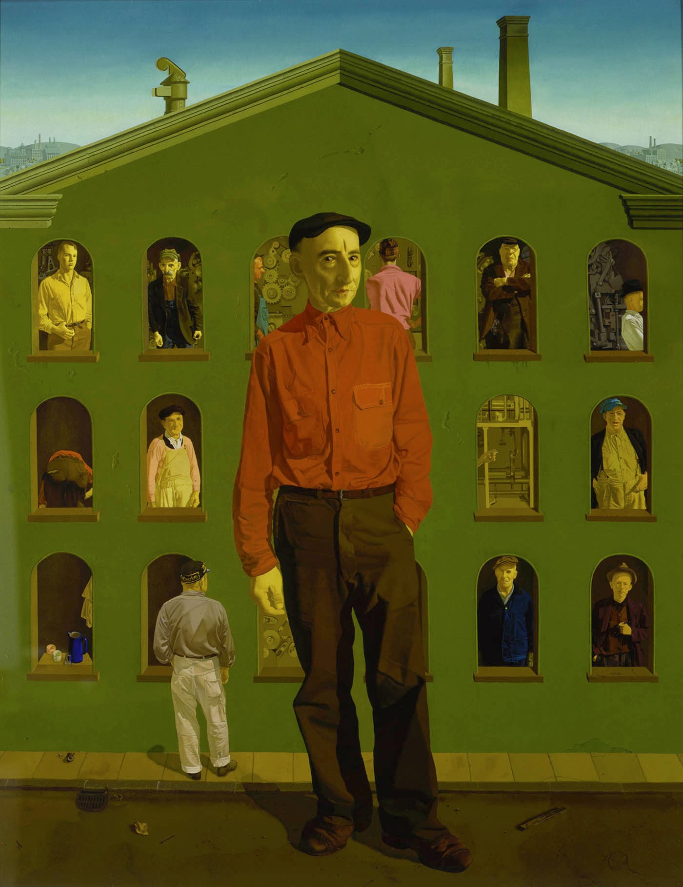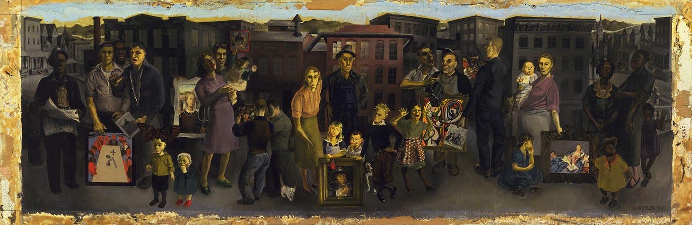 The 1943 piece “Workers and Paintings” is a panoramic portrait of several family-like groups standing in front of a detailed cityscape. Each unit presents a painting to the viewer, including Grant Wood’s “American Gothic,” Picasso’s “Girl before a Mirror,” and a Diego Rivera portrait of field workers. All of the featured painters sought to elevate the common people, both in their work and their politics, and Sharrer’s piece conveys the lovely sentiment of art having a place within the structure of the family.
