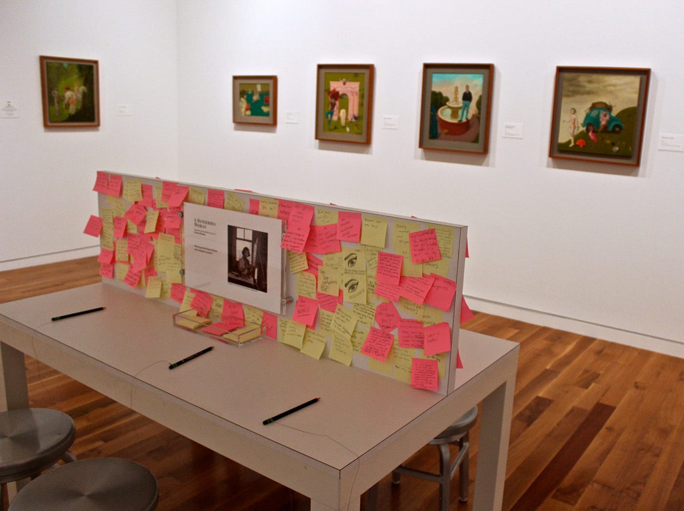 Another station, in the furthest reach of the exhibition, offers an opportunity for visitors to respond to a question: “Why do you think Honoré Sharrer was a dangerous woman?” The responses I saw ranged from “She was a communist” to commentary on her subject matter and perspective, with Post-it notes piling up to create cross talk and conversation; some observations were as simple as, “Dogs, dogs, everywhere.” Taken as a whole, the simple answer might be: Sharrer was thought-provoking and difficult, and her art is too. That’s disruptive for people who seek to deny women the full complexity of their human condition. All the more reason to seize the opportunity to visit this remarkable exhibition and acquaint oneself with its subject — a truly unusual painter and largely unsung visionary whose time may have finally come.