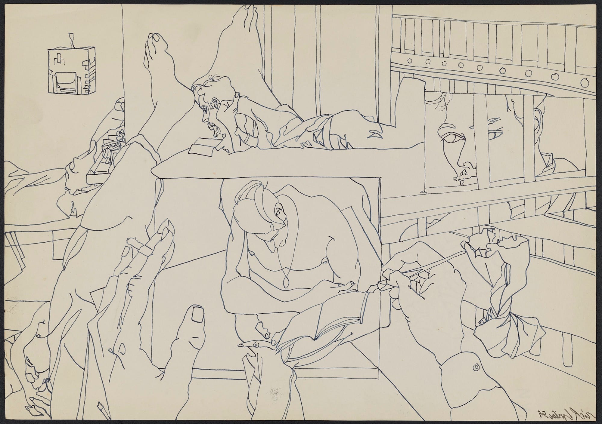 Barton’s reconfiguring of space is found in a number of works, which often include his hand holding a brush and drawing. When he depicts himself drawing, he is both outside and inside the work he is making. In “Untitled (Inmates reading)” (1959), he depicts his right hand rising up from the bottom edge, holding an ink pen and, on a rectangular surface, drawing a bare-chested man engrossed in a book. His left hand is visible, holding a cigarette; extending further back are two bare feet. It seems that Barton is lying on his prison bed, drawing his surroundings. The scale shifts from a man lying down to a large face peering in through the bars, to part of a torso glimpsed in the lower right corner. Despite his surroundings, what Barton conveys is the pleasure of drawing the world around him, which here consists of a moment of quiet leisure.