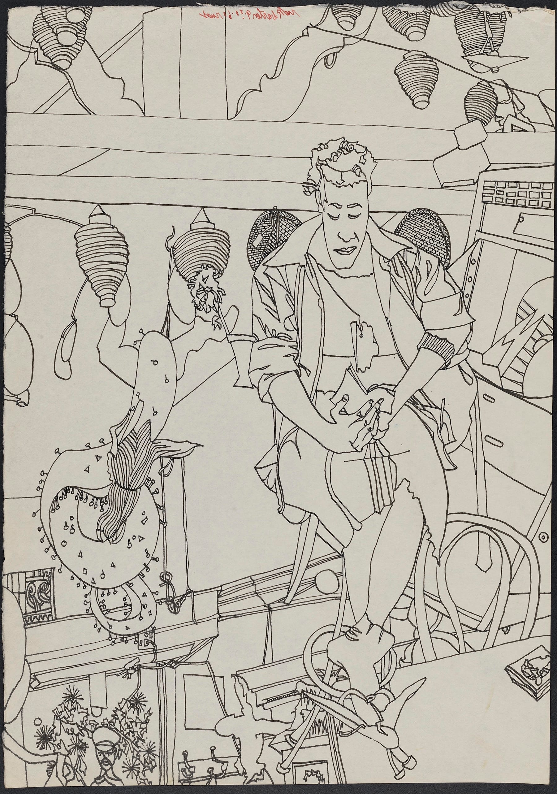 The exhibition, which comprises drawings done between 1958 and 1962, is divided into four themes: Intimate Interiors, Ritual and Architecture, Social Spaces, and Flora and Fauna. Barton drew in pen and ink, filling the page with intricate linear details that often reflect multiple perspectives, particularly in his Intimate Interiors and Social Spaces, which include cafes and jails, where he did time for drug possession. He was queer artist who loved to draw men. His line is wonderfully fluid and his drawings show no hesitation.