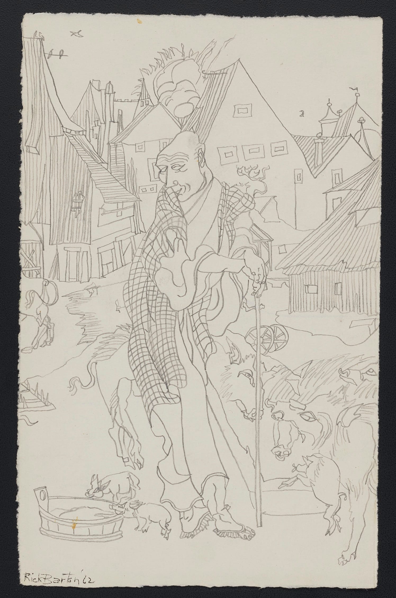 In her catalogue essay, “Rick Barton’s Infinite Room: An Opening,” Federman suggests that Barton may have seen Andy Warhol’s early line drawings in his self-sponsored exhibition, Fifteen Drawings Based on the Writings of Truman Capote, at the Hugo Gallery (June-July 1952). One of the most fascinating works that Federman delves into is a pencil drawing, “Untitled (After Dürer and Hokusai)” (1962), in which Barton has drawn an old man by Hokusai in a setting lifted from Dürer’s engraving “The Prodigal Son Amid the Swine” (1494-96). Derived from disparate sources, Barton depicts the old man gazing down at two piglets eating from a round wooden feeder. This detail binds the Asian figure and the western setting, as well as complements Barton’s use of line. It is in works like this that we glimpse Barton’s adventurous spirit and acute visual memory, his particular genius.