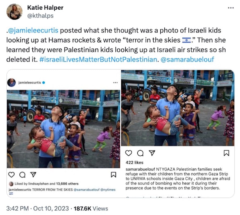 A barrage of social media disinformation related to the escalating Israel-Palestine war has made it far more difficult to discern the credibility of visual evidence. Earlier this week, actor Jamie Lee Curtis used a photo of scared children looking up at the sky taken by freelance Palestinian photojournalist Samar Abu Elouf in her Instagram post in support of Israel, only to delete the post after the image was revealed to depict an Israeli airstrike on the Gaza strip. Curtis’s error shows how deceptively easy it is to take mischaracterized videos and images at face value in our desperation to raise awareness and show solidarity.