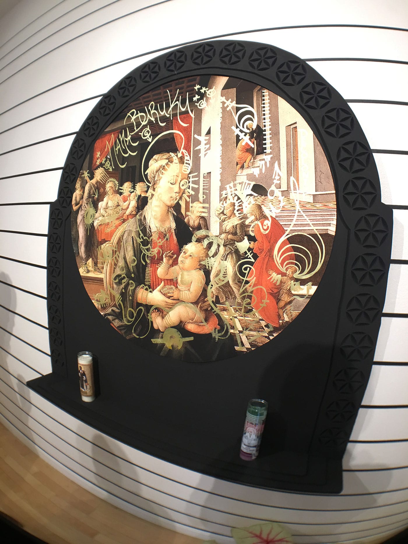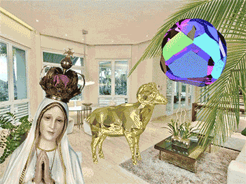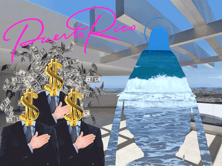 This piece is about disconnection. The viewer enters a space defined by black-and-white grid lines, a simulation of some sort of digital space without a true location. The installation aims to create the feeling of being displaced. Where am I? In a large monitor, a blue sky with white clouds plays on a loop. Two monitors display animated GIFs featuring manipulated images of mansions and luxury condos, spackled with religious iconography and American dollar signs. Majestic palm trees, an office desk, a Greek bust fill a landscape reminiscent of vaporwave album covers and Tumblr blogs. The room features an altar crafted with both digital and analogue tools, an altar to Nana Buruku, grandmother of the Orishas in the Yoruba mythology and spirituality. The altar is a modified version of Fra Filipo Lippi’s “Madonna with Child and Scenes from the Life of St. Anne” (1452). This is a tribute to Caribbean syncretism: Saint Anne is correlated with Nana Buruku in Yoruba spiritual practice. West African slaves were able to continue their spiritual and religious practices by aligning their own deities with Catholic Saints. There’s so much to Puerto Rico that people in the mainland United States don’t know.