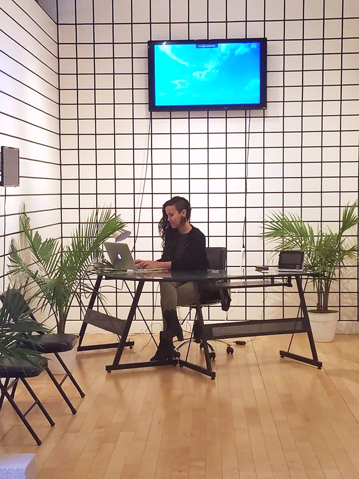 In Shey Rivera Ríos’s Fantasy Island, an immersive installation currently on view at AS220’s Project Space in Providence, Rhode Island, the island “miracle” that’s marketed to mainland American consumers is simulated and détourned using sculpture, video and GIF, sound, a series of talks, and a zine. (Rivera is also the artistic director of AS220.) From the gridded walls of her “office” to the glass desk where she “works,” Rivera re-creates a late ’80s luxury advertisement interior and uses it as a gathering place where she and her audience can discuss colonialism’s abuses with sincerity. On screens displayed throughout the installation, GIF collages juxtapose Puerto Rico’s pixilated landscape with flashing and scrolling financial and religious iconography.