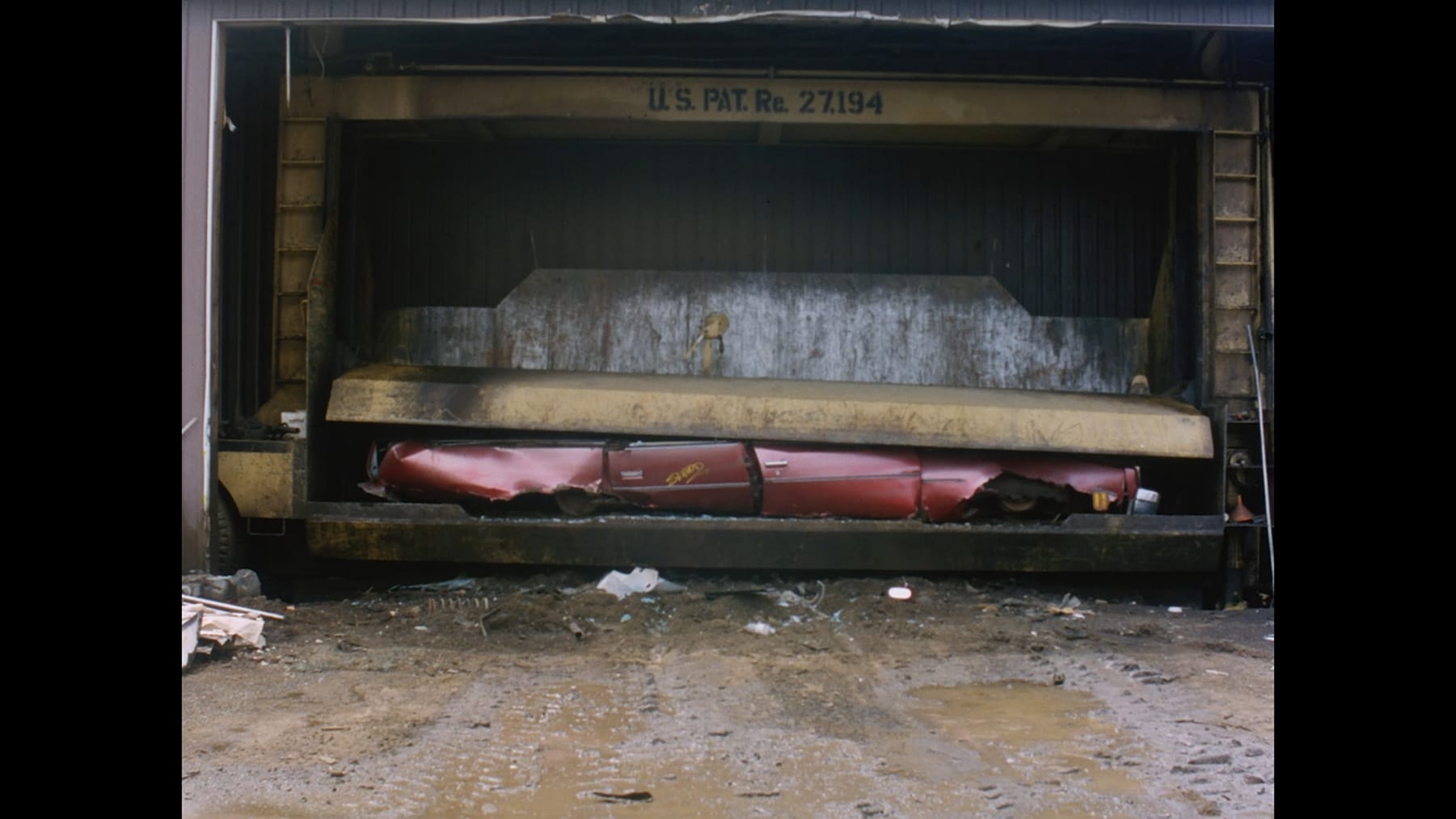 Screening in a midsize, L-shaped room, the three films form a dispassionate, controlled gallery of destruction and transformation. Cars are crushed, cubed, dragged, hauled, and flattened in long, largely unbroken shots. (“Century”’s near seven minutes appear to consist of a single take.) Through such static shots, Everson heightens the sculptural, procedural ways the cars fall to ruin, punctuated by moments of snapping — if still undisturbed — intensity: pinched windows giving way in explosions after more than a few minutes in the compactor.