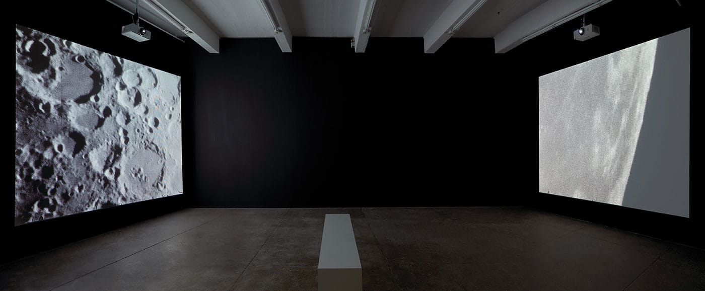 The fourth work in the show represents something quite different and fascinating from Everson. “Rough and Unequal” (2017) is a pair of 16mm films, here projected digitally on opposite walls in their own room. They are tersely resonant, capturing the moon in extended and enlarged mirroring shots. One half focuses on the moon’s craggy surface, a monochrome image that fills the whole scene; framed much further away, the other projection fixes on the moon’s place in the darkness of space, opening as just a wan swatch of light. Slowly, darkness creeps into the former film as the camera pans towards a patch of black; in the latter, the same measured movement gathers more and more moon into the frame until it is nothing but, mirroring the opening of the other film as well the phases of the satellite. Absorptive and reflective, “Rough and Unequal” plays with the utility of restriction, the vision it lends and the views it cuts out.