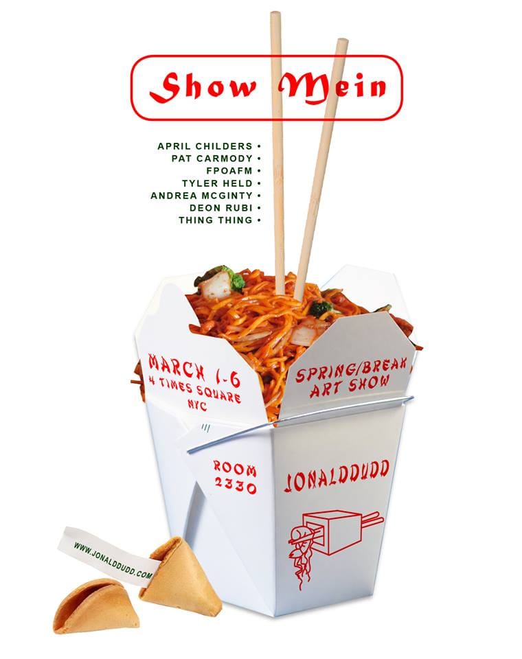 Every year, a small group of organizers of the Spring/Break Art Show vets all curatorial proposals and artworks, submitted in response to a theme, in part to ensure that the exhibition features no culturally insensitive works. A group show at this year’s sixth edition of Spring/Break testifies to the necessity for such a process that is careful and cautious, after a final installation that differed entirely from its original, approved concept caused outrage for its Orientalist presentation and promotional material. Show Mein — a play on the Chinese noodle dish — opened Wednesday in the fair’s new location at 4 Times Square, with flyers and promotional materials edited as the result of critical conversations that have unfolded over the last week.