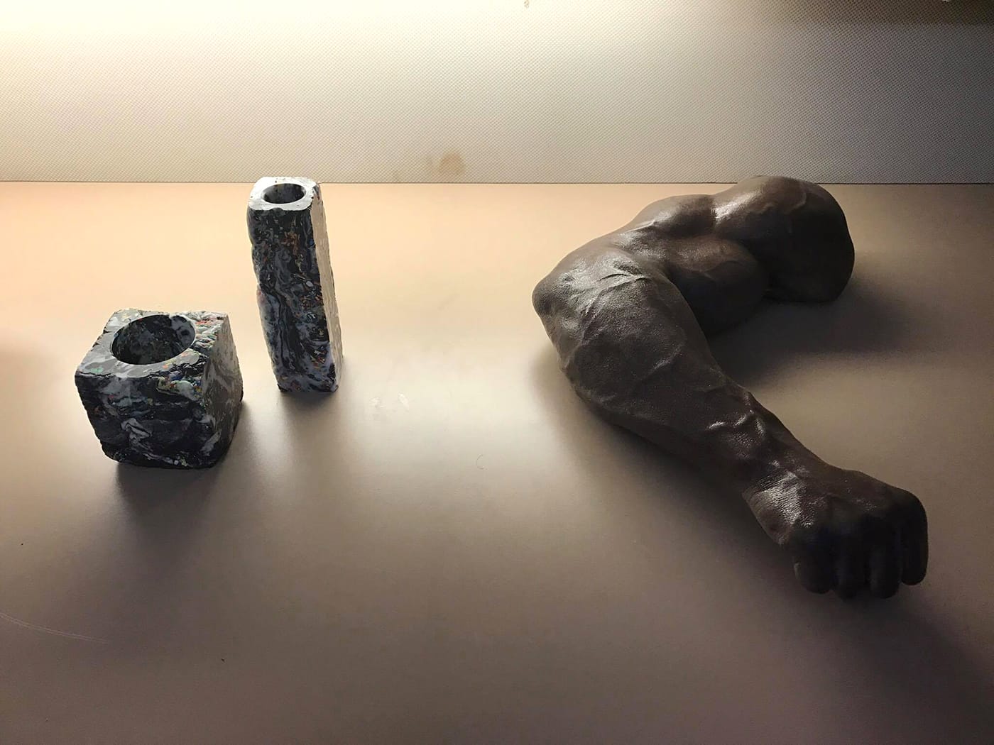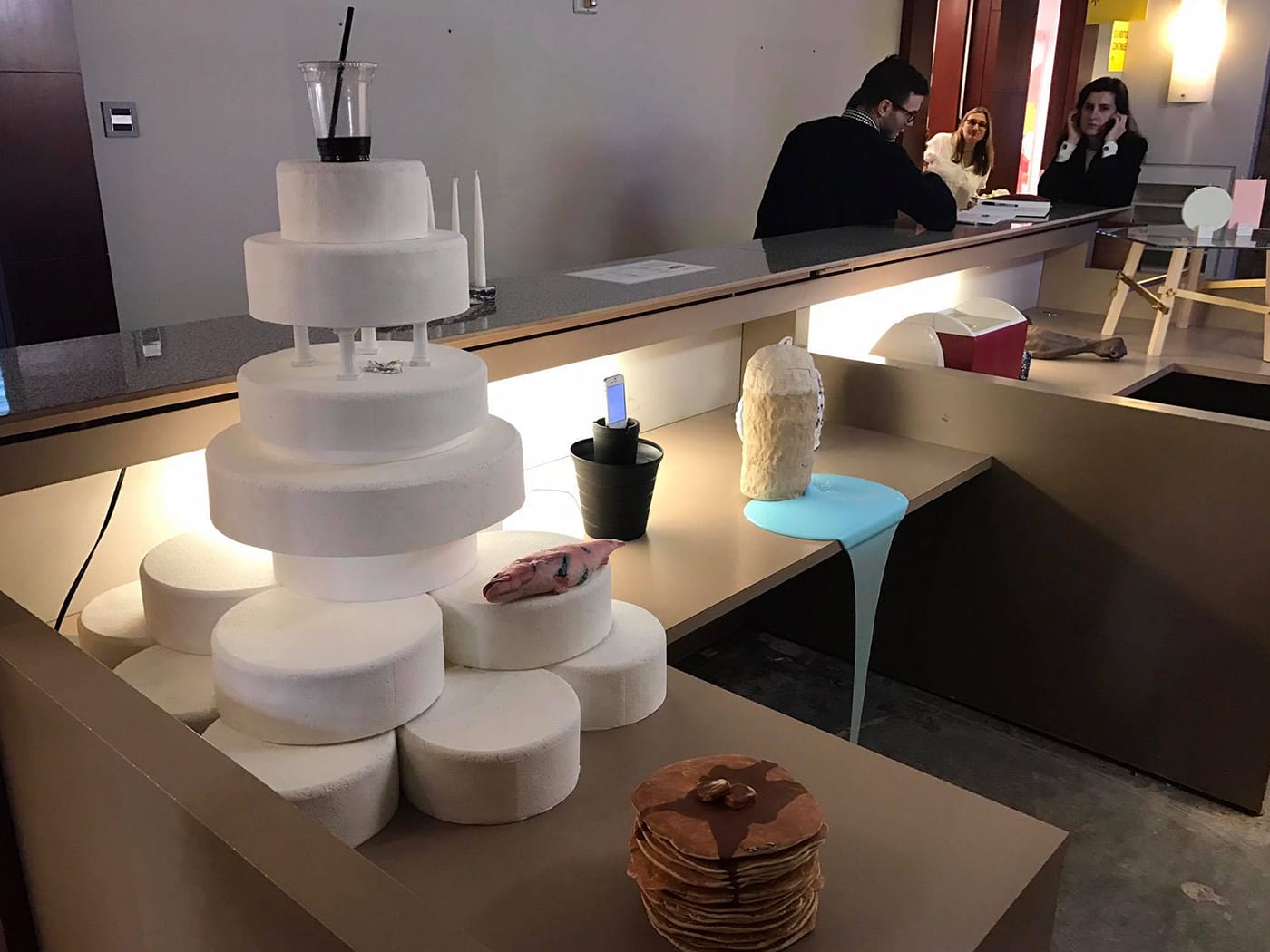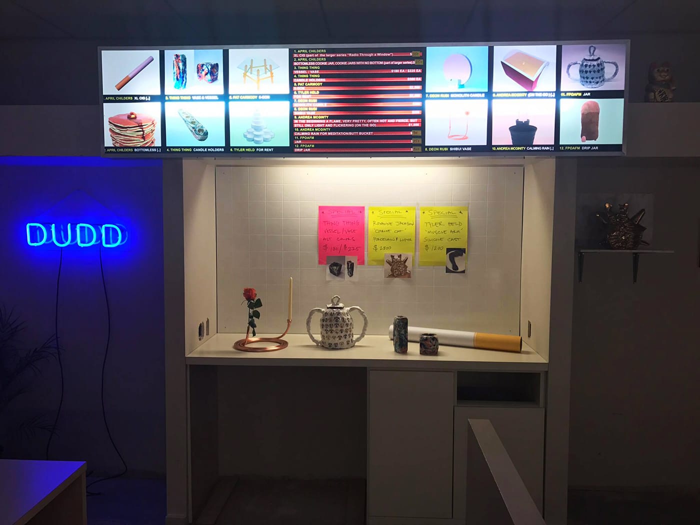 The curators describe the show as framing “the works of seven artist/designers within an aesthetic homage to New York City’s Chinese takeout restaurants. The presentation of seemingly disparate works within a non-neutral context aims to highlight the similarities between objects by displacing the perceived tension onto the environment.” It’s an exhibition entirely different from the duo’s original proposal for this year’s “BLACK MIRROR” theme: Spring/Break initially accepted their concept of a furniture series designed by the duo’s other practice, Nice Condo, as Cambron told Hyperallergic. She added that they made hasty decisions that “we now regret not full[y] vetting with our peers or the SPRING/BREAK curatorial team.”