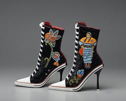 But some feel it’s Johnson, and not the exhibit, that condescends. Critic Lee Rosenbaum recently reported on the Brooklyn exhibit for the Wall Street Journal and then in the Huffington Post contextualized the Brooklyn exhibit with other exhibits at the National Museum of the American Indian and the Denver Museum. Rosenbaum agrees that some of the contemporary works don’t match up to the traditional ones, but faults Johnson for letting a few “kitschy” works — like Teri Greeves, “Great Lakes Girls” (2008), a pair of intricately beaded high-heeled boots is the prime kitsch example both critics cite — obscure the show’s informative value.