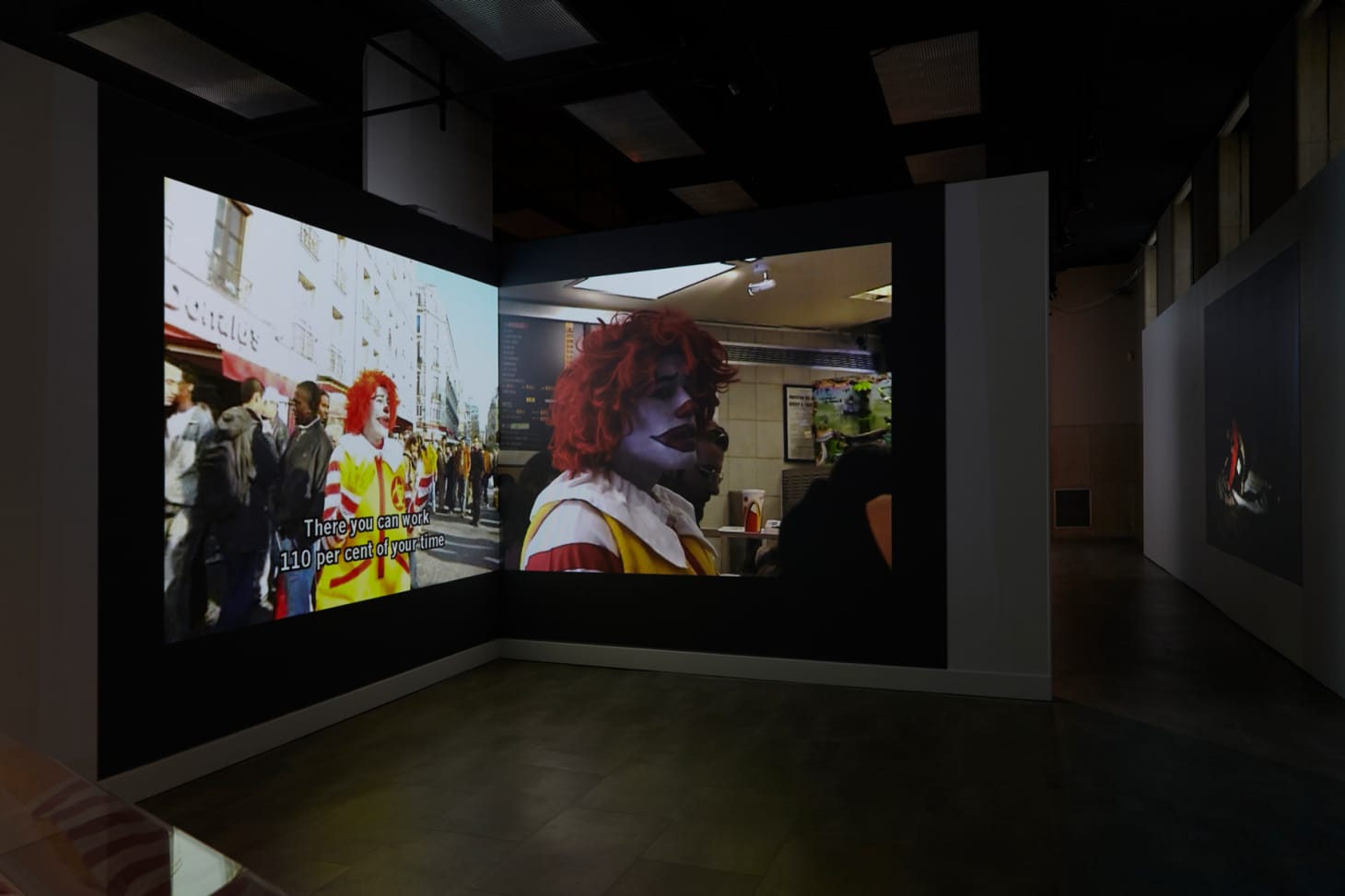 Particularly relevant within a US context, the earliest work included, Donald McRonald (2003) is displayed through video documentation and the inclusion of the costume from the performance piece, in which a performer dressed up like Ronald McDonald stands in front of a McDonald’s near the Parisian contemporary art center, Palais de Tokyo. In a humorous tone, the clown discusses the diseases you can get from eating a hamburger at the fast-food chain, and details the low paid labor of its employees. Through its performative nature, the work reveals the grotesque side of consumption, making passersby and diners accomplices of an oppressive and unjust capitalist economy.