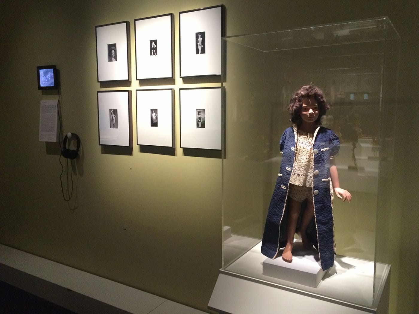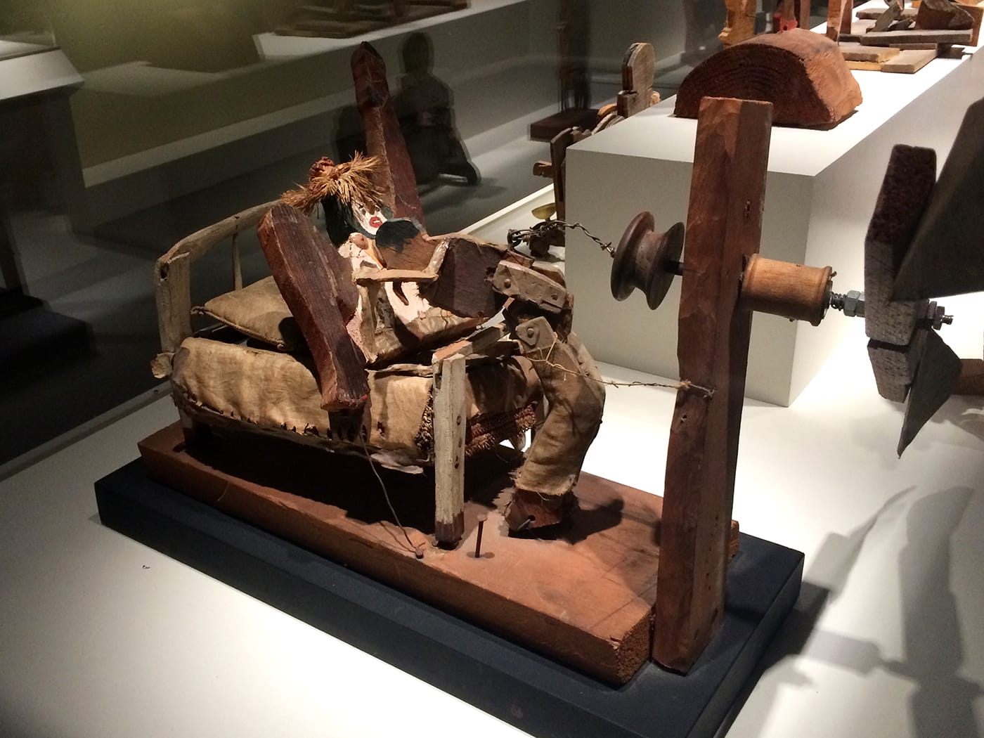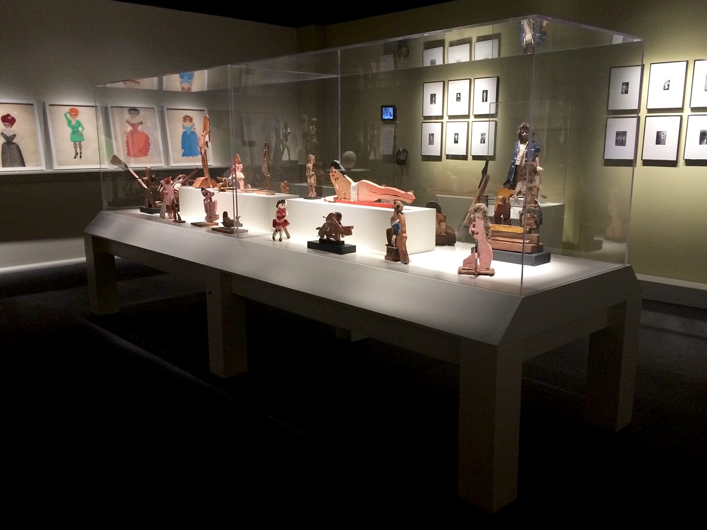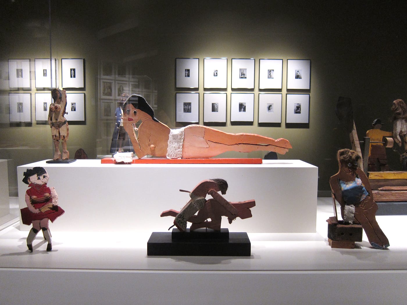 Fear of discrimination is one of the lamentable reasons why some of these artworks may have been made in the first place — to release suppressed longings. But our open access now to such raw expressions of desire can also be jarring or even disturbing. One of the best-known outsider artists represented here is Morton Bartlett, who sculpted meticulous plaster dolls of children and photographed them as if they were alive, in special outfits. A number of his black-and-white images from 1950 cover one wall, accompanied by a single polychrome figure of a girl wearing a night coat. Some speculate that art making was a way for Bartlett to work through his own childhood experiences, as an orphan since age eight; others claim that his works, which show young girls’ bare skin and even, at times, their underwear, represent a sexual deviance.