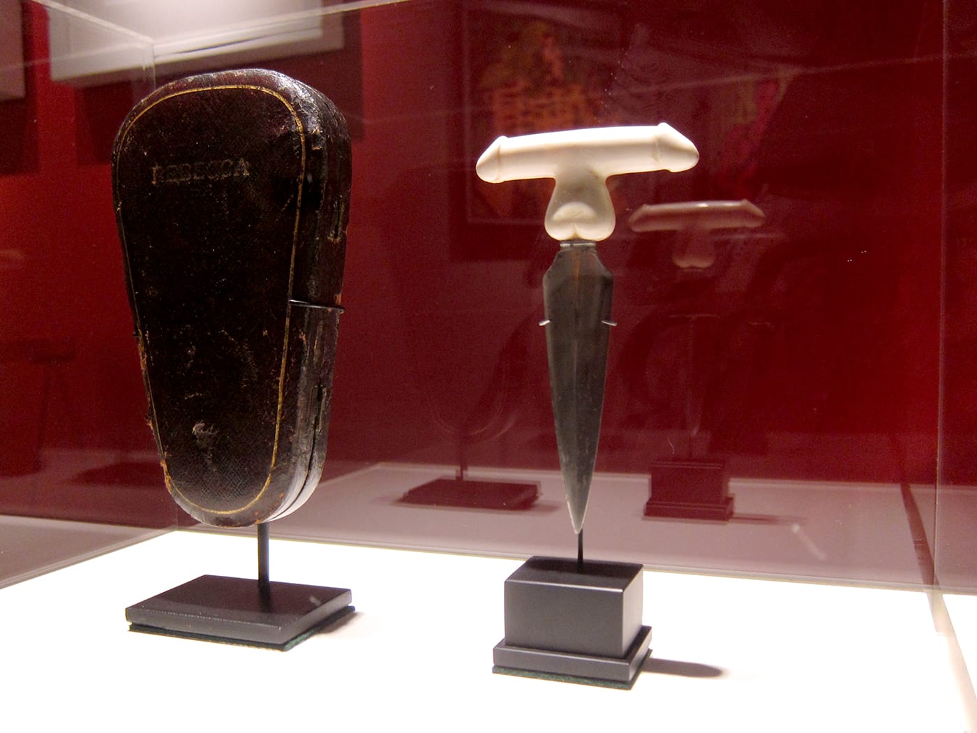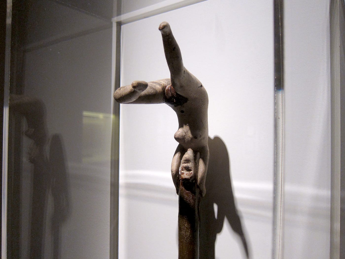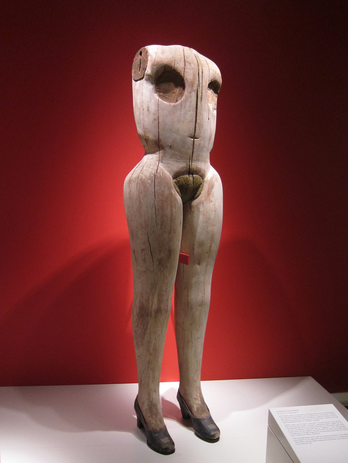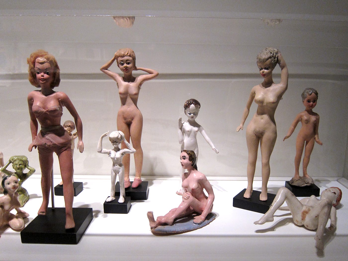 Some of the most curious pieces on view were made by people whose names have been lost to time, such as a wooden cane with a handle in the shape of an open-legged figure or a wooden display mannequin carved like a women’s body. Others are culled from the personal archives of artists whose stories we’ve learned of over time, like Morton Bartlett and Henry Darger. None of the objects, by the dozen or so creators, has ever been publicly shown before — which places viewers in a challenging position. In the case of Von Bruenchenhein, his wife (and collaborator) exhibited the photographs after his death, but the show at the Museum of Sex doesn’t always relay how the works transitioned out of their private spheres. Moving through the dimly lit exhibition, which is structured like a display of mini collections, I felt like a wary voyeur, scrutinizing strangers’ hidden hungers in full view.
