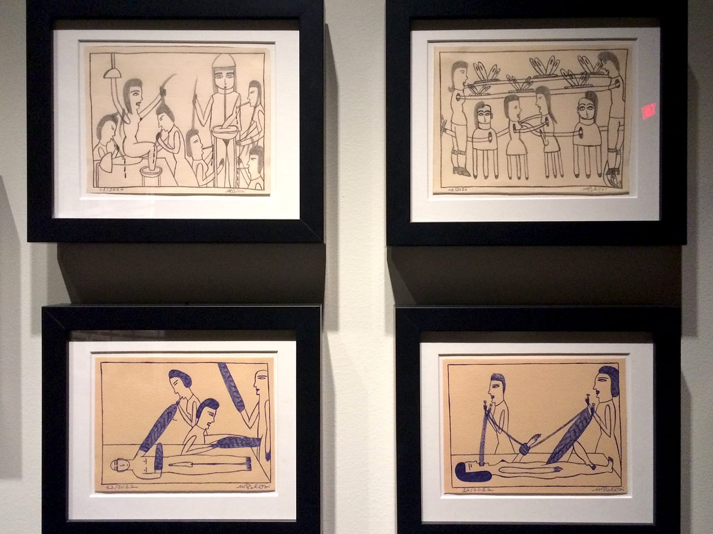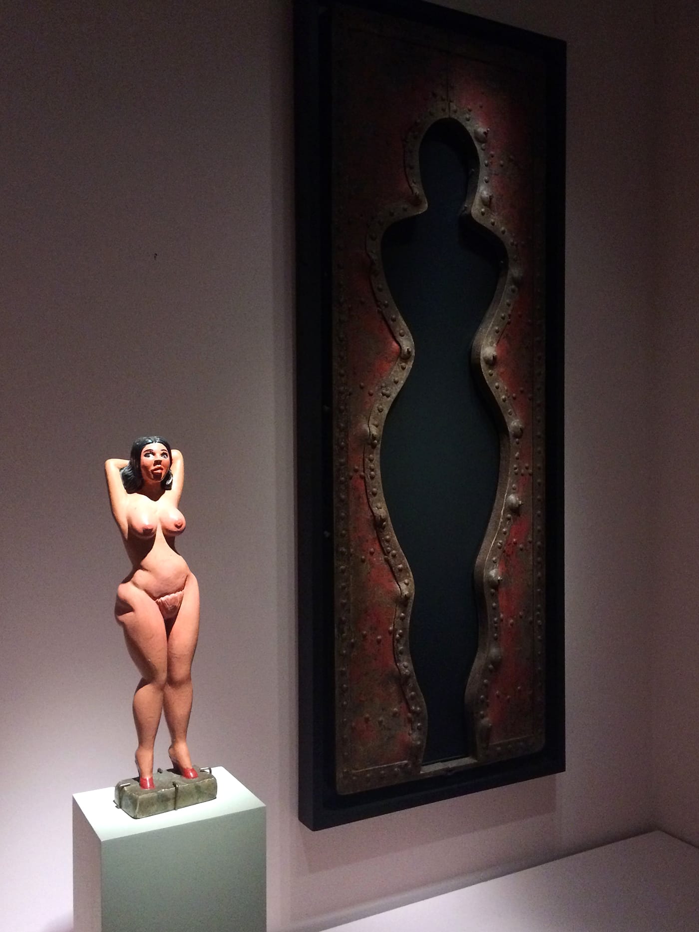 I had stronger reactions to pieces by Royal Robertson, a sign painter from Louisiana who died a decade ago, and by Miroslav Tichý, a Czech photographer who passed away in 2011. Robertson’s posterboard images are like comics panels, filled with text and speech bubbles. He suffered from paranoid schizophrenia and believed he was a victim of a worldwide female conspiracy; his resulting visions, though bright and colorful, are rage-filled pictures that target women in violent, misogynist scenes. Tichý obsessed over women in another way: using cameras he made out of cardboard and recycled material, he surreptitiously photographed unsuspecting women in his hometown of Kyjov, focusing on their bodies and often bare skin. The images are soft and grainy, but the distinct photographic process couldn’t prevent me from drawing connections with modern-day shutterbugs who steal shots of women for their personal pleasures.