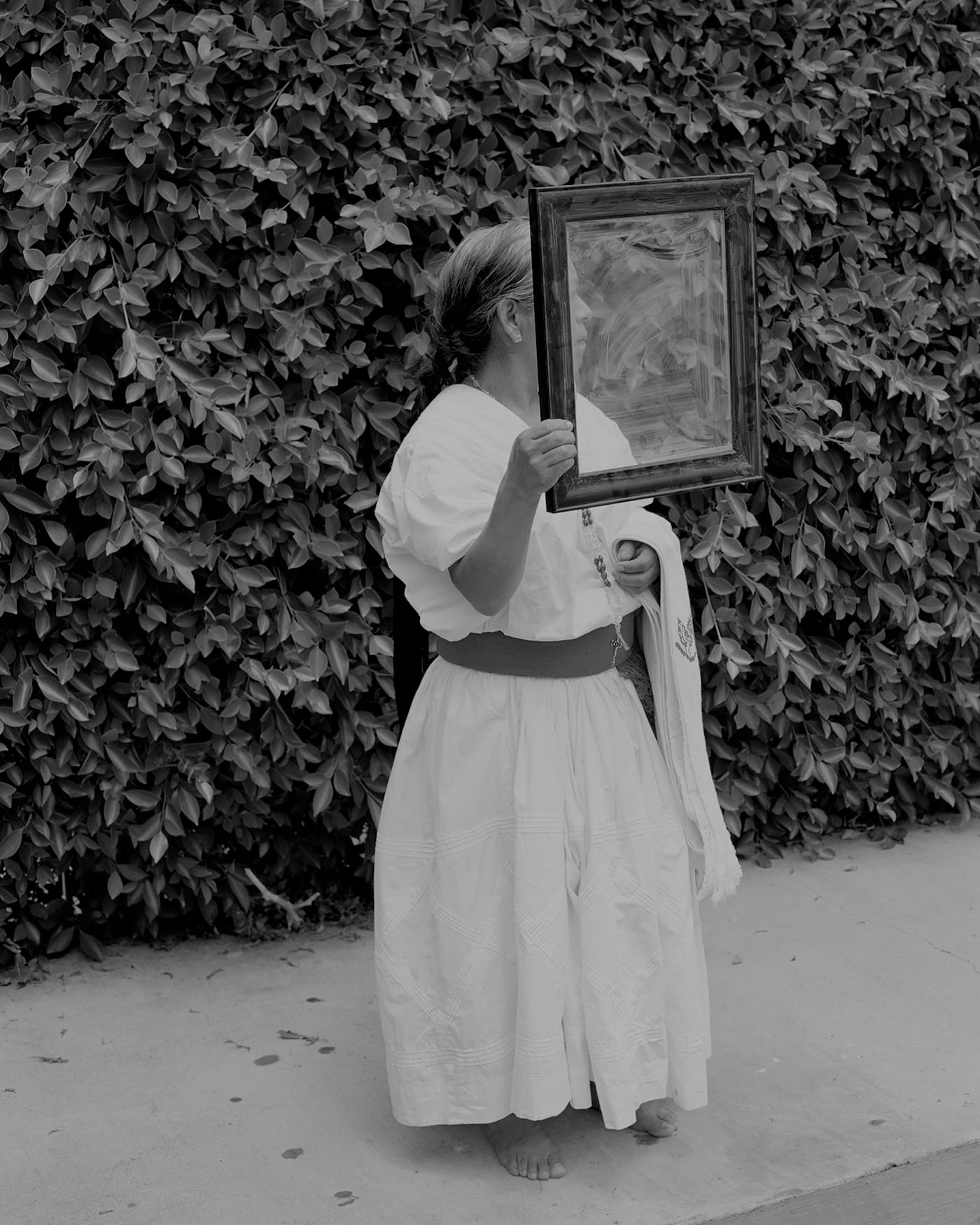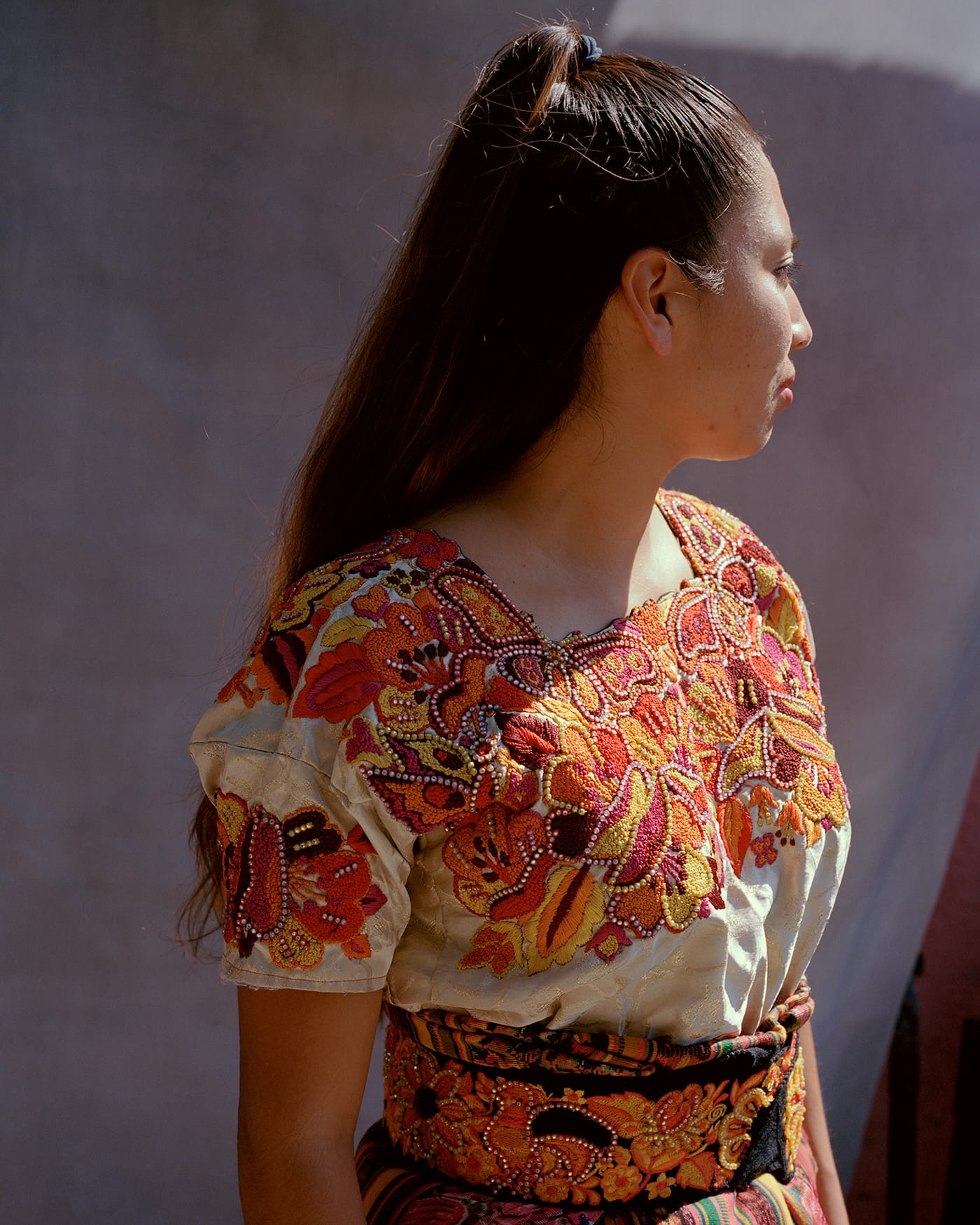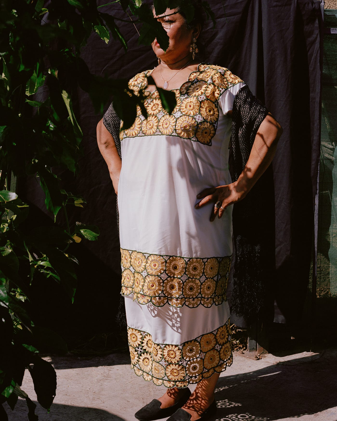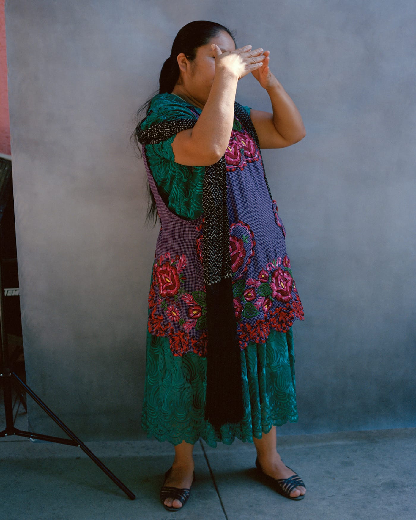 LOS ANGELES — The 21 women featured in the book Diža’ No’ole cover their faces with their hands, turn away from the camera, or peek out from behind bunches of flowers or leaves. They do not hide out of shame, but out of a desire for self-preservation. They are all undocumented, indigenous women from Mexico and Guatemala, who are now living in Los Angeles. This is not to say they do not reveal anything about themselves, their lives, and their journeys. The photographs are interspersed with written excerpts from hours of interviews that range from hopeful to heartbreaking, including even a lengthy recipe for one woman’s “favorite food from your culture”: relleno negro, a yucatecan black soup made from chile de arbol, turkey, and hard-boiled eggs. The women are each photographed wearing a hand-embroidered garment from their pueblos, showcasing a material connection to a place that they may not have been able to return to for years or decades.