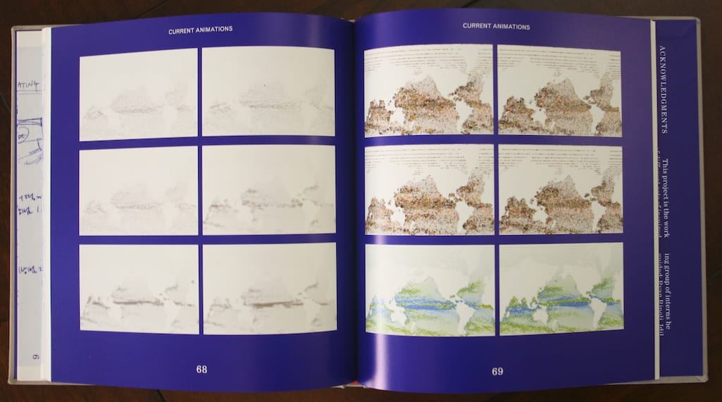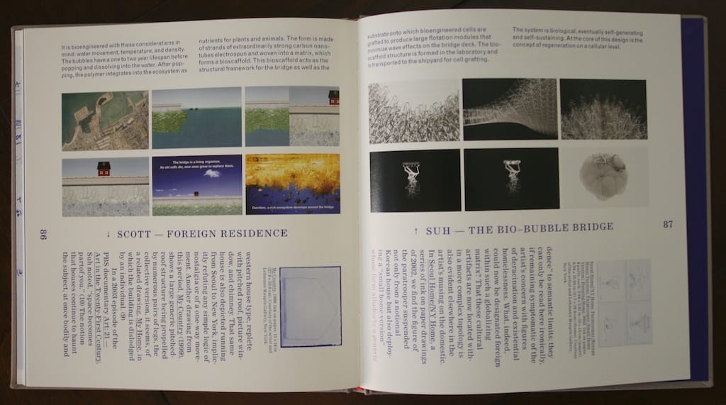 A blue-background segment of the book has the requisite documentary photos of the exhibition, installation shots and still images from the animations Suh produced with his team. But where the book really shines is in the mashup pages that mix up project statements, renderings and the essays of catalogue contributors, which run on the bottom of the pages but are oriented vertically such that one has to turn the book sideways and flip pages backwards to read them. The interactive nature of the book itself gives a density and heft to an inter-textual project that relies just as much on text as it does on images. Though the avalanche of information is a little hard to navigate at first, the effort is more rewarding than straight up left-to-right reading, and puts emphasis on the collaborative nature of Suh’s work and the inter-relationships it confronts.