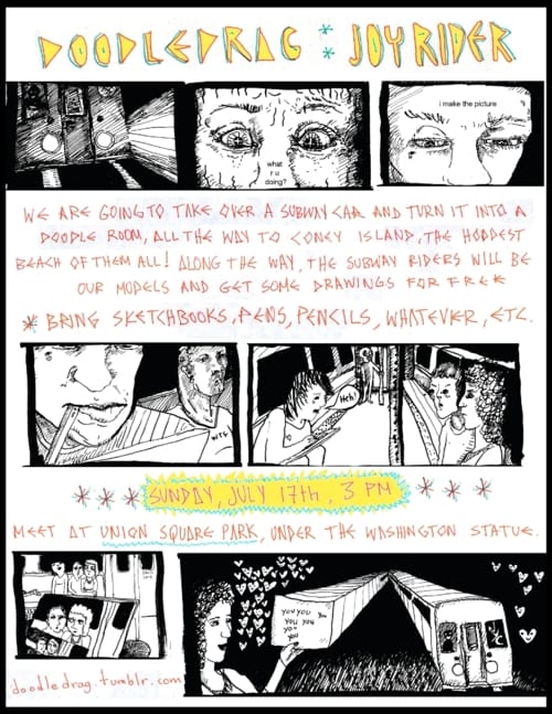The Doodlers will be meeting in Union Square, next to the Washington Statue, and riding the train all the way to Coney Island. Participants are asked to bring drawing utensils, paper, and tape — D. Drag encourages the riders to post their work up on the subway walls, as well as distribute their art to “jaded New Yorkers.” To that I say, we’ll show you jaded!