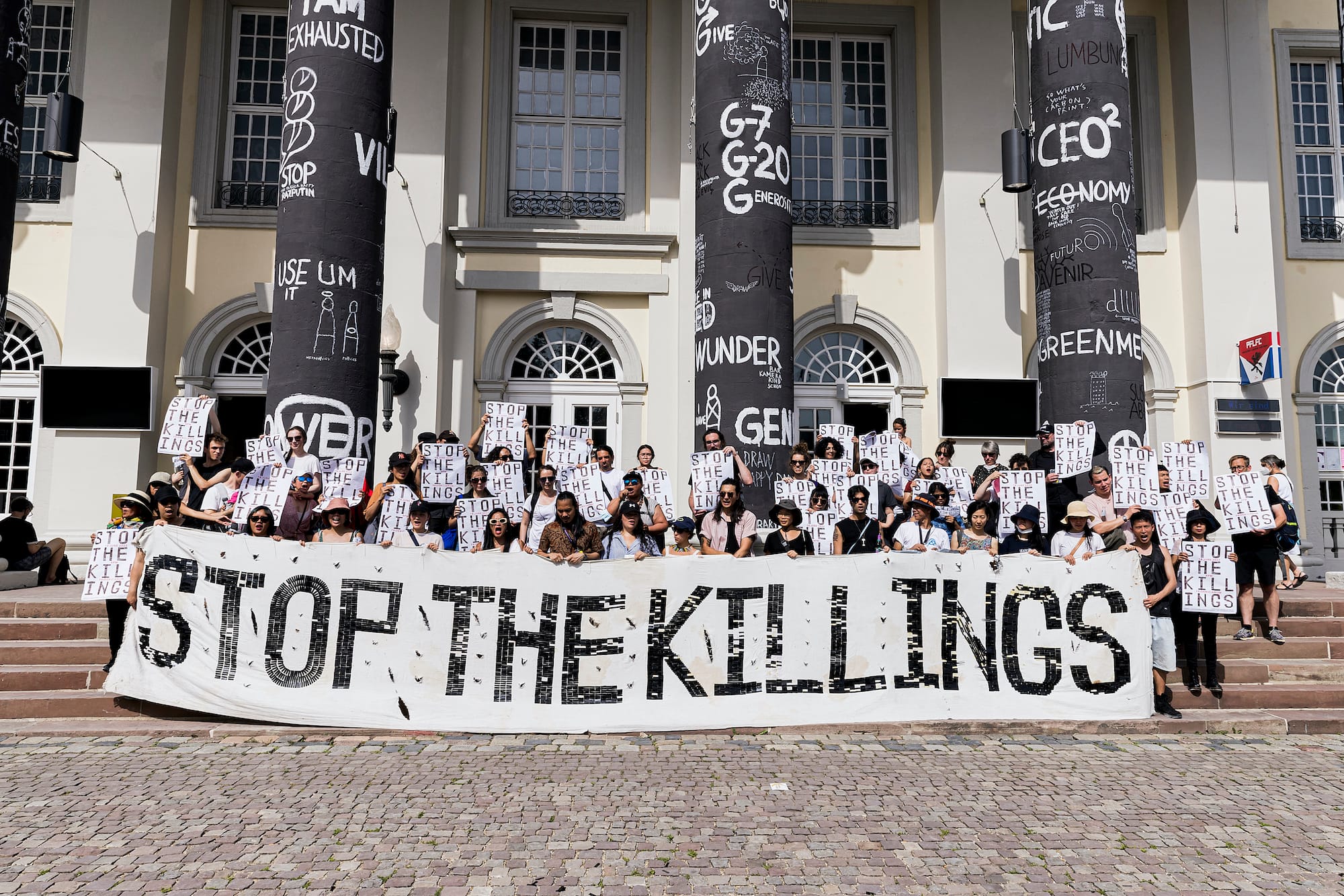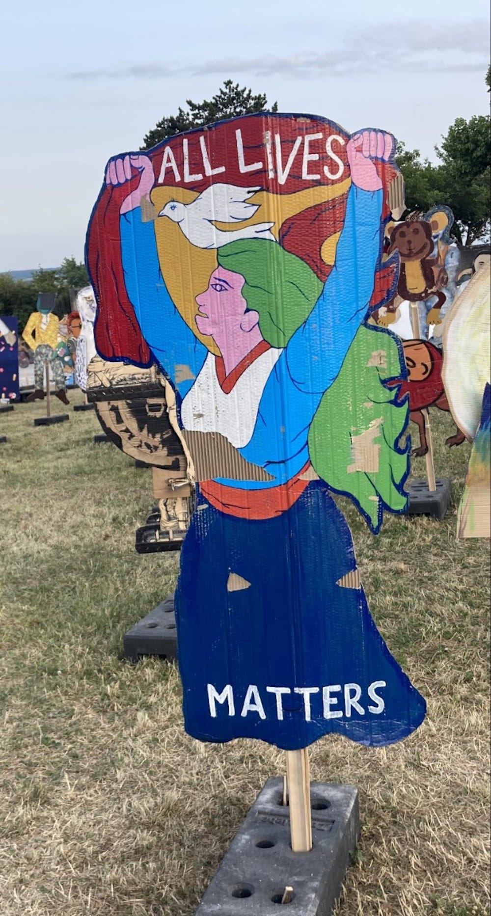 Unsurprisingly, so many voices vibrating in unison also mean cacophony — the “DIY chaos” and controversy of which critics have already duly covered — from the removal of an anti-Semitic caricature in the epic People’s Justice installation by artist collective Taring Padi to the resignation of documenta director Sabine Schormann and consultant Meron Mendel, head of the Anne Frank Educational Institute in Frankfurt. During my mid-June stroll through the Friedrichsplatz, People’s Justice also featured, among its hundreds of cardboard figures, a cut-out of a woman with billowing lime-green hair that read, “All Lives Matters" [sic], seemingly oblivious to the slogan’s conservative connotations the United States.
