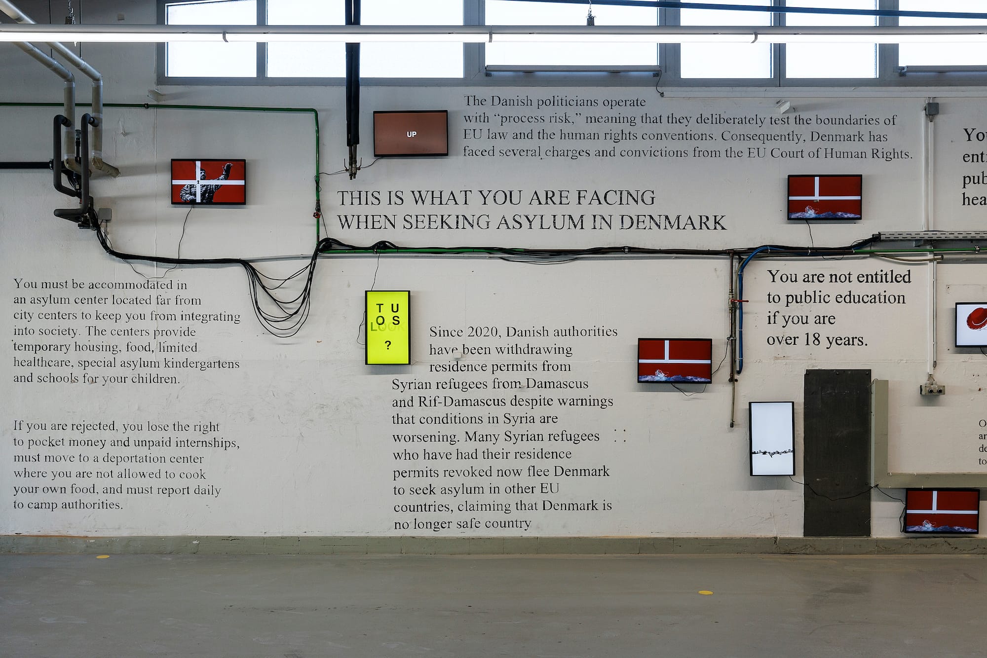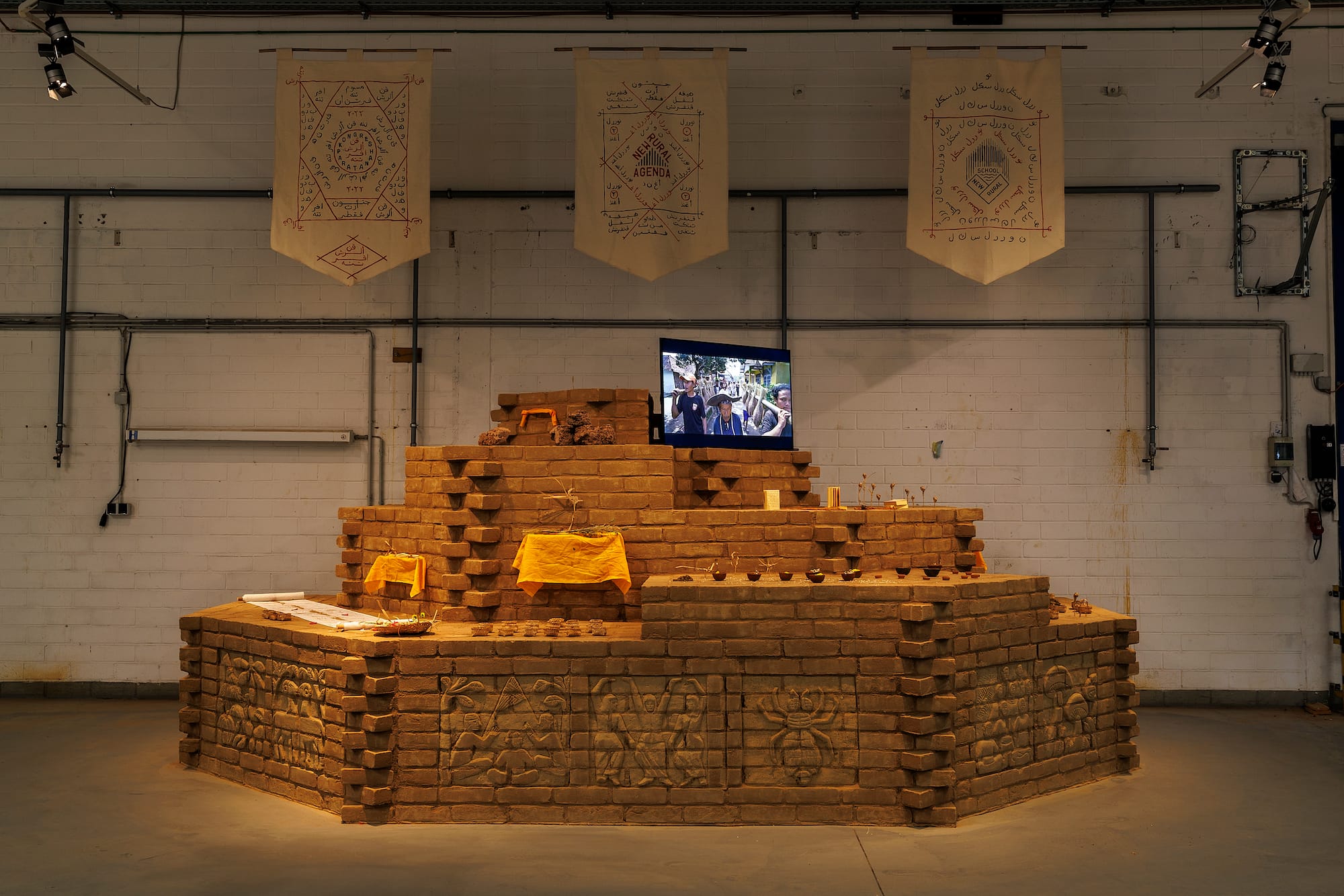 About two kilometers east of this performance site, in Bettenhausen, Hübner Areal manufacturing plant stretches across an industrial space with more than a few buildings that appear long condemned or uninhabited. Toward the front of the former factory, a tall vertical screen plays the video installation “Smashing Monuments” (2022) by Sebastián Díaz Morales, in which members of ruangrupa verbally address gigantic statues that commemorate historic Jakarta figures and events. As the camera trails the shoes of each speaker, we receive only a clue as to that person’s gender and age. In one video, a 30-something man holds his infant daughter and beseeches a monument for guidance; in another, a 20-something woman expresses ambivalence about her national identity.
