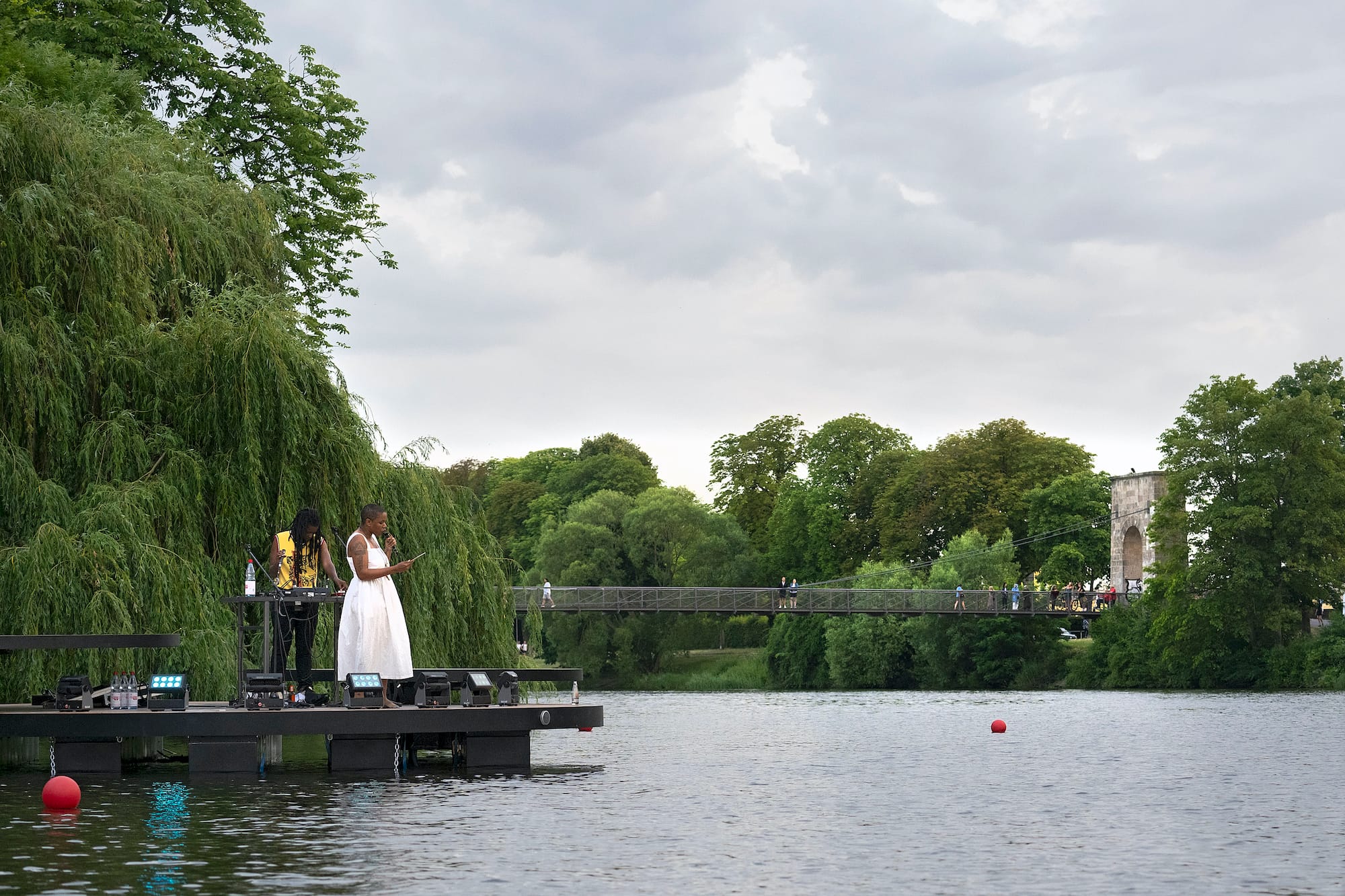 On the first night of my visit, a hypnotic concert by Black Quantum Futurism, a Philadelphia-based practice formed by Camae Ayewa and Rasheedah Phillips, echoed off the Fulda river and its bridges, packed with sunset spectators. Combining Afrofuturist spoken word with the jazz instrumentals of Irreversible Entanglements, who played on the bank above, Ayewa and Phillips performed Watch Night Service in honor of Juneteenth. Standing beside Phillips on “The Clepsydra Stage” (2022), a floating formation constructed of two circular clocks that move with the current, Ayewa declared, “To wait in the water … to submerge the Master’s clock, is a revolutionary act within a revolutionary act of escape.”