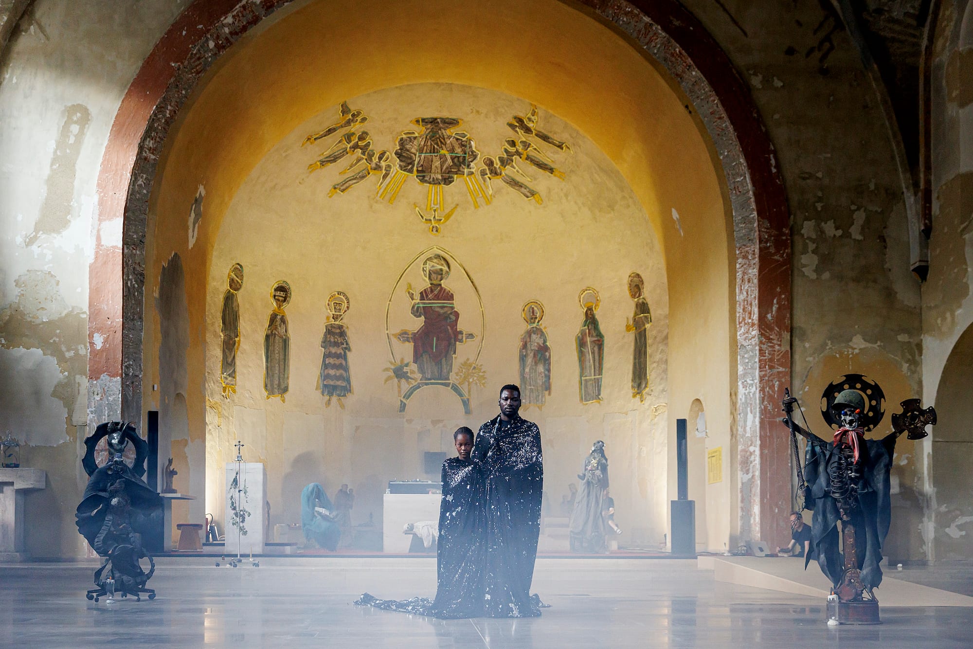 KASSEL, Germany — A piano concerto ricochets off the walls of a midcentury train station. A giant, plush dog’s head dwarfs passersby. A circle of young men in matching shorts and cotton socks march behind a woman with a high black ponytail, mimicking her peppy motions around a grassy plaza. A Madonna made of a human skeleton grins from the altar of a church, a gray plastic baby doll clutched against her ribs.