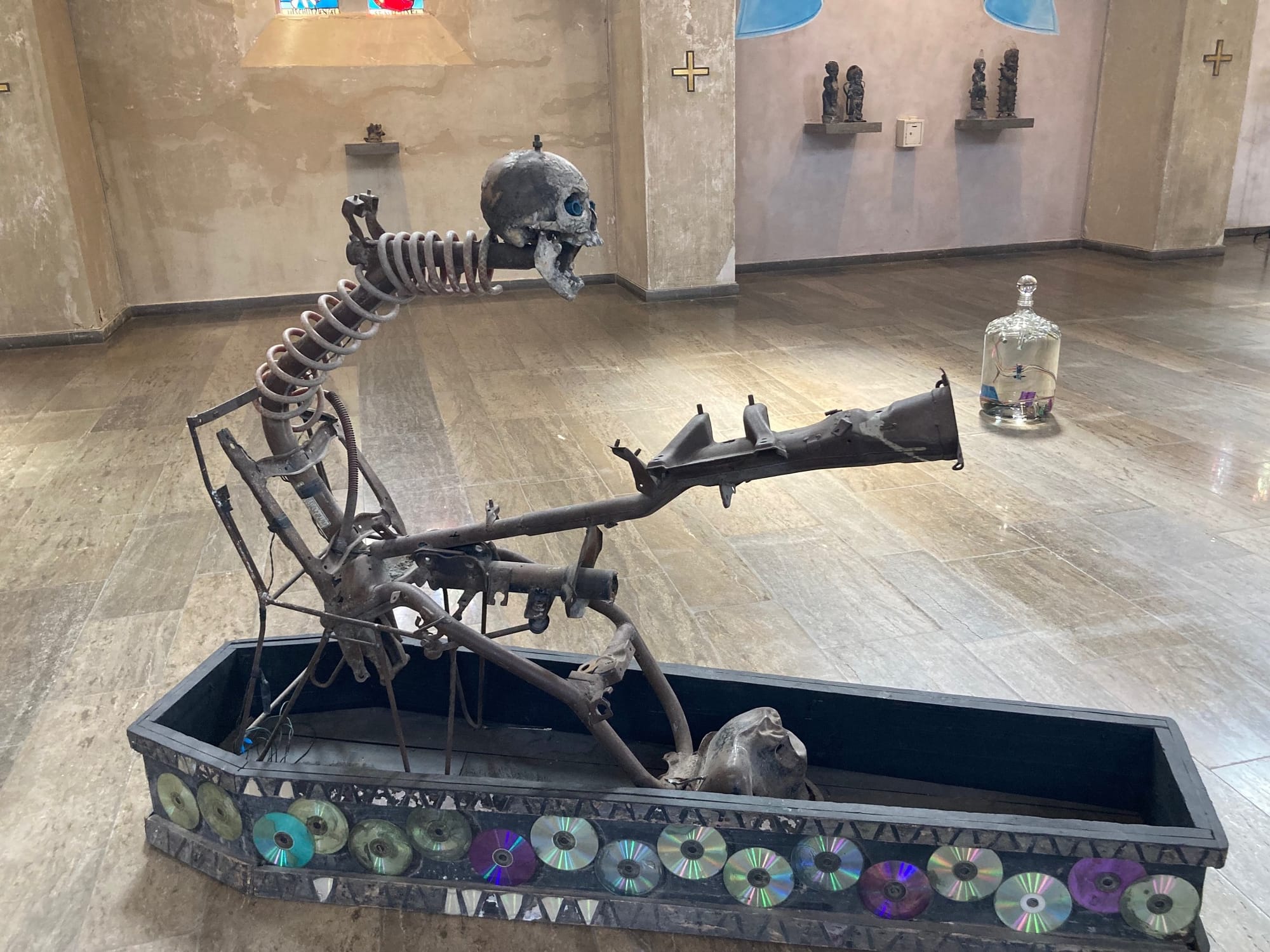At St. Kunigundis, a 1927 edifice tucked behind a stone wall to the east, a traditional Roman Catholic Church is repurposed to dramatic effect by the Haitian artist groups Atis Rezistans | Ghetto Biennale, its interiors and grounds filled with mixed-media sculptures comprised of found materials and urban detritus. Below the 13th station of the cross engraved into the chapel nave hangs a framed photo of three nude women of color, who stoically hold a huge snake. Revolving illuminated plastic totems flank the chapel vestibule filled with votive candles. Skeletal remains scaffold anthropomorphic statues constructed of corroded metal, nails, and iridescent CDs. Signage clarifies that, in Haitian culture, the use of human bones as an art medium is not considered offensive. Under the vaulted arches of St. Kunigundis, the spectacle is breathtaking.