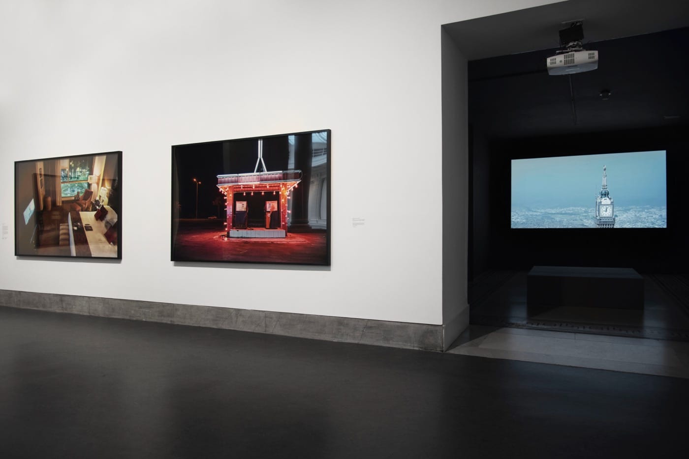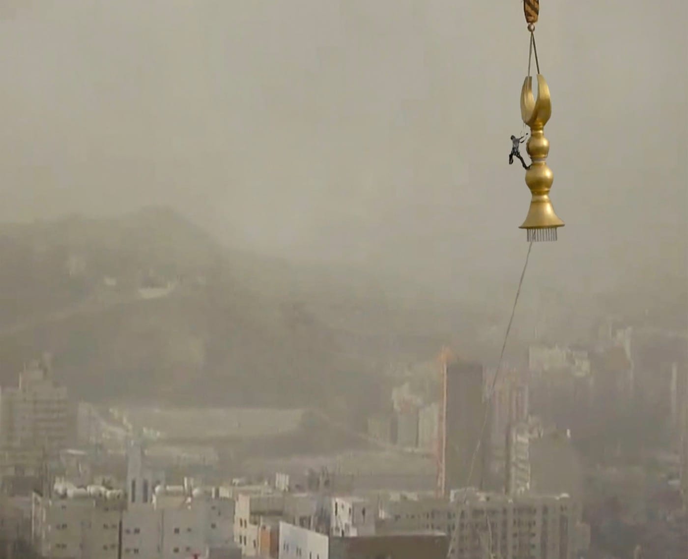 In his video King Kong (2013), Mater records the Clock Tower from a helicopter, witnessing its incredible magnitude in the arid Meccan geography. In another video titled Leaves Fall in All Seasons (2013), he constructs a narrative from footage taken by the laborers who built the complex. He depicts not only their pride to have taken part in the project, but also their grievances, such as late payments, awful living conditions, as well as the strikes they carried out. The video concludes with a sequence of demolitions of newly built apartment blocks, which were cleared to make way for further upscale development. Also filmed by the laborers themselves, this sequence appears to erase the meaning of their own work. Mater also showcases a large collection of colorful window frames which he salvaged from demolitions. They are an homage to what he imagines existed before, but was erased. Like the Hajj itself, Mater’s exhibition is a unique experience. It is a journey into a Mecca of spiritual and financial wisdom, modest and luxurious life styles, and sacred and profane experiences.