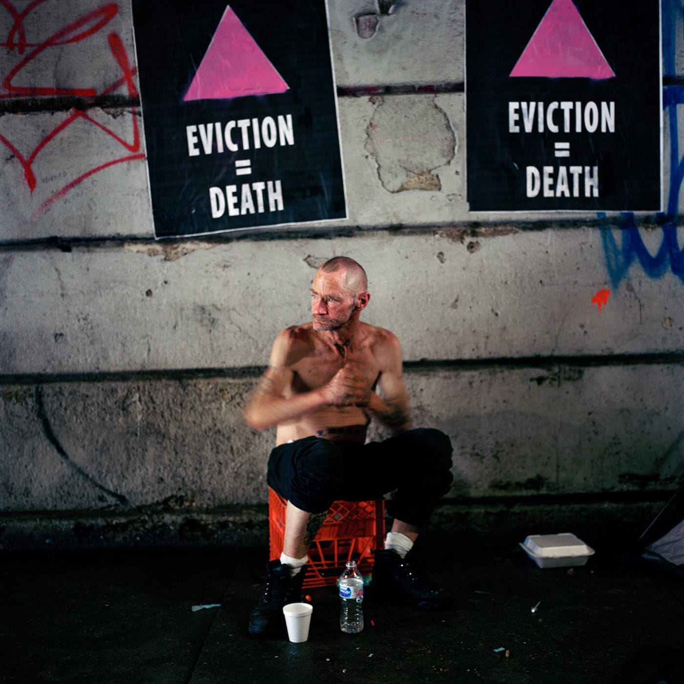 One of Stockbridge’s photos features a man named Country sitting on a red carton with two posters behind him that read, “EVICTION = DEATH.” The signs are references to ACT UP’s iconic “SILENCE = DEATH” campaign and also here feature the pink triangle synonymous with the LGBTQ community. Shirtless and with a shaved head, Country looks away from the camera. He is shaking his arms so furiously that it blurs the image. The photograph’s label describes him as rocking back and forth “after injecting heroin the day before the city evicted drug users camped beneath the Kensington Avenue underpass.”