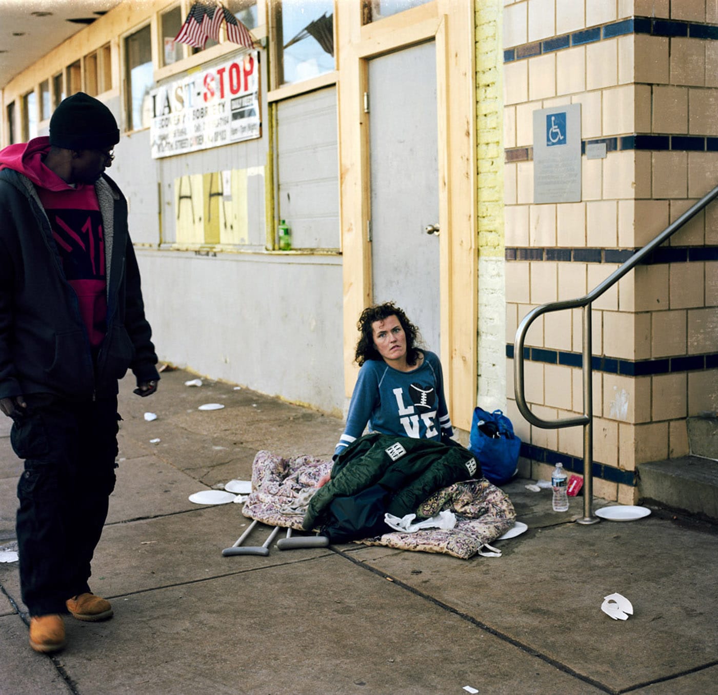 The two photographs described above are emblematic of Stockbridge’s approach toward documentary photography. He likes to prompt viewers with visual cues of despondency. “Crystal” (2018) continues the trend. The subject reclines on the sidewalk pavement with dirty jackets stretched across her lap, and an onlooker beholds her disheartening situation. She wears a shirt that reads, “LOVE” with a football replacing the “O.” Behind her are four American flags waving in the wind above a sign that says, “LAST STOP.” Though a little heavy-handed, the message is clear: Crystal lives a precarious life because of her addiction.