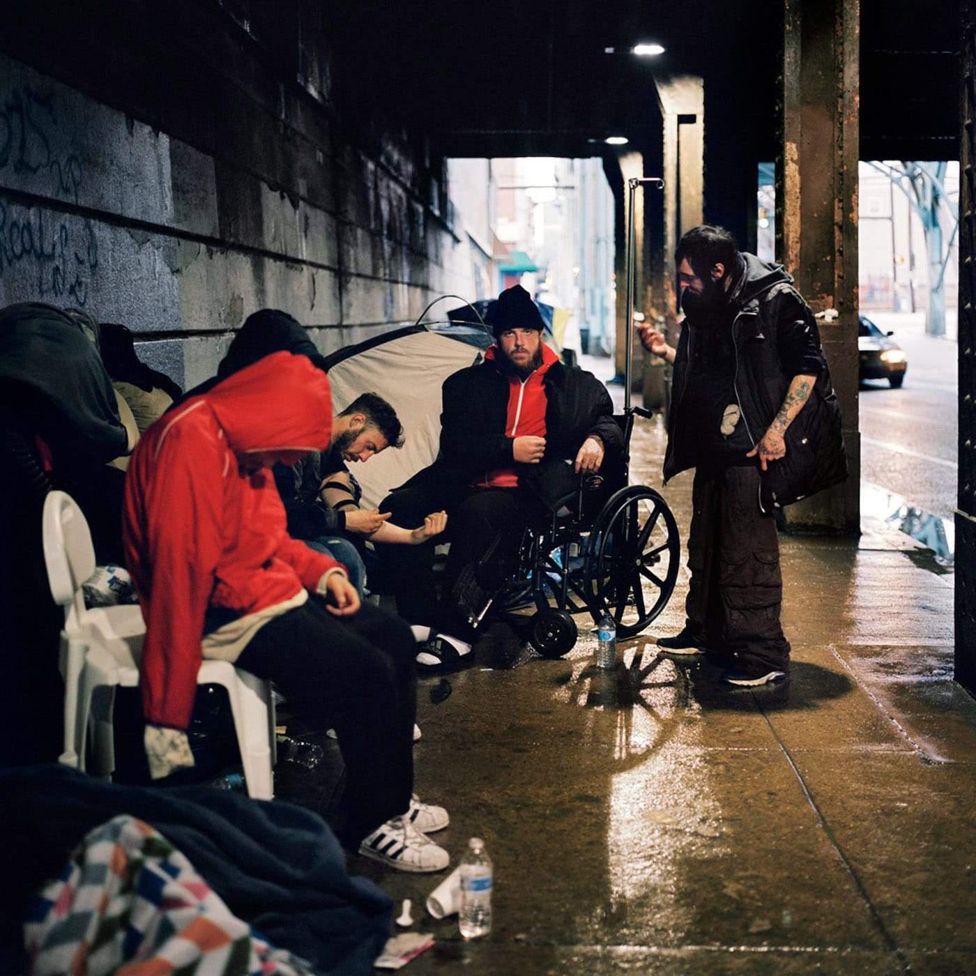 Another image included in the exhibition depicts a group of four men huddled together among a row of tents and blankets. “Heroin users often rely on one another to inject their drugs for them in their necks, when accessible veins collapse and are no longer usable,” reads the caption. At the photograph’s center is a man sitting in a wheelchair wearing a black jacket and red hoodie. Nearby is a man that crouches over his arm, which is tightly bound in preparation for injection. In the foreground, another man in a plastic chair slumps over himself, passed out.