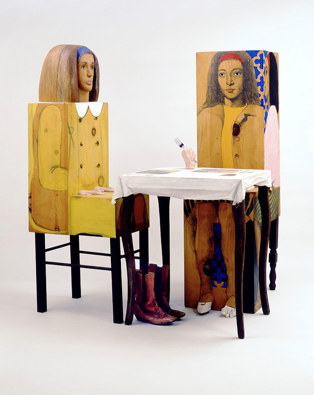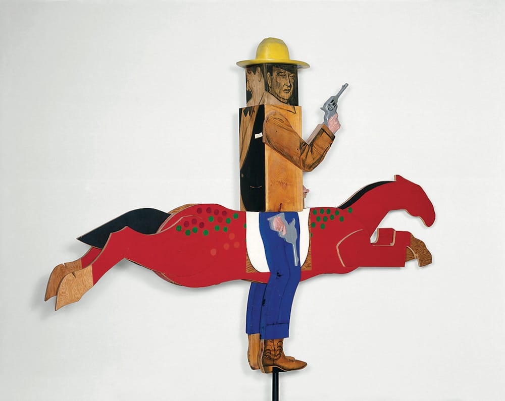 We might start by juxtaposing Marisol’s funky “John Wayne” (1963), a wooden sculpture of the actor holding his gun astride a red horse, with Warhol’s “Double Elvis (Ferus Type)” (1963), his silkscreen image of Elvis dressed as a Hollywood cowboy. (I am imagining rearranging the hanging of some of the works in this exhibition.) Or we might put her vast installation of 15 wooden figures, “The Party” (1965–66), alongside Warhol’s “The Last Supper,” a copy of Leonardo’s “The Last Supper.” Or, finally, we can put her “Dinner Date” (1963), two seated, painted wood self-portraits, who avert their eyes from one another, alongside of his early “Make Him Want You” (1961), in which a man seemingly awkwardly propositions the woman he is embracing. As we can see here, both Marisol and Warhol were damaged, socially withdrawn personalities. No doubt that was one source of their bond.