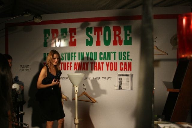 Horowitz, who is better known for his socially critical video works, presented “Free Store,” which the announcement portrayed as an “interactive installation” where guests (equipped with specially screenprinted totebags) would exchange objects they brought for the donated items already in the store, including contributions from artists such artists as Rob Pruitt, Maurizio Cattelan, and Marilyn Minter. The store was to “puncture a hole through the rarefied art world ether of commodity display and sale,” the announcement noted.