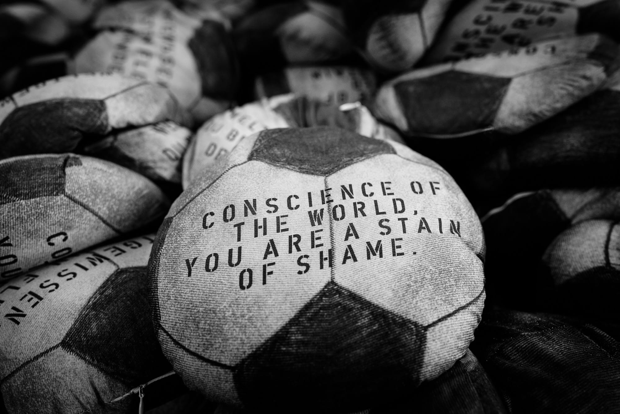 Amid the 2022 World Cup, Trieb staged a poignant protest installation outside the FIFA headquarters in Zurich, Switzerland, where he placed 6,500 sand-filled soccer balls — each representing a migrant laborer who died on the job building the Doha stadium — emblazoned with a quote by Dutch artist and anti-Nazi resistance fighter Truus Menger-Oversteegen: “World conscience, you are a stain of shame.”