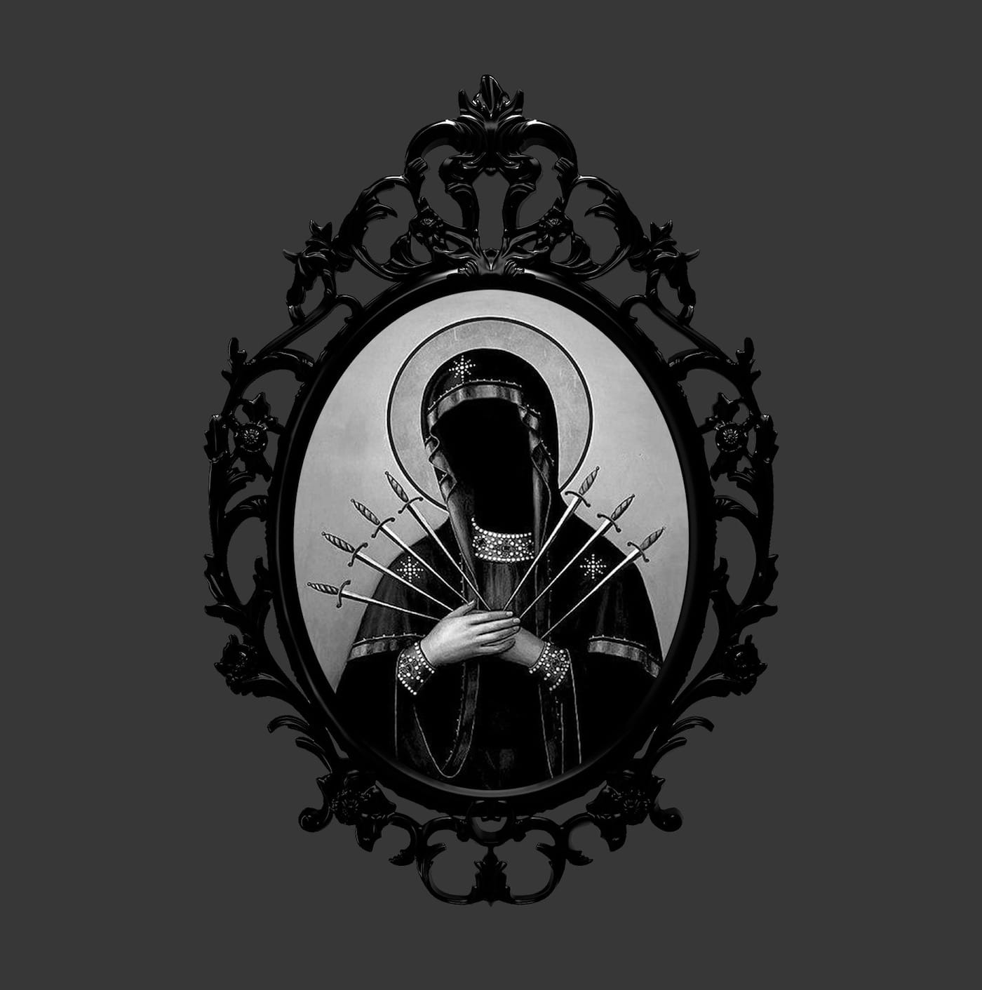 Dolores is inspired by a sword swallower and Our Lady of Sorrows, the figure of the Virgin Mary with seven swords piercing her heart.