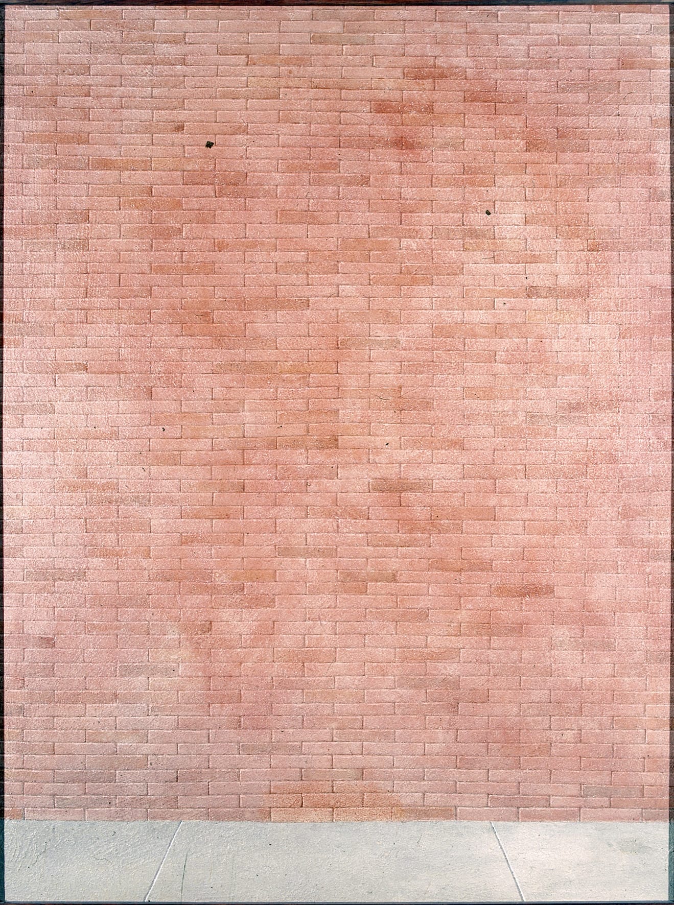 Gnoli’s close-ups, limited to an earthy palette of ochres, siennas, umbers, grays, and blacks, abstract the imagery into simple, colored shapes. His use of sand creates an even, but fuzzy surface, giving the images a slight buzz. The sandy surface also gives the paintings the impression of the hardness of a mural, painted on the side of a building, and one work, “Brick Wall” (1968), actually was painted to appear as what the title suggests. Gnoli was linked with Pop, and like Jasper Johns with his flag paintings, seemed to enjoy subverting modernist metaphors by substituting the actual representations for their abstractions.
