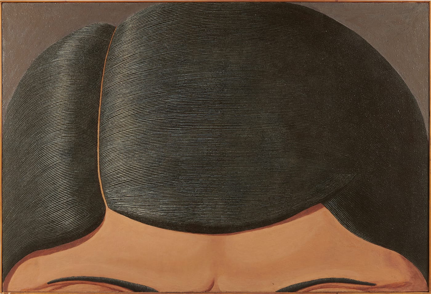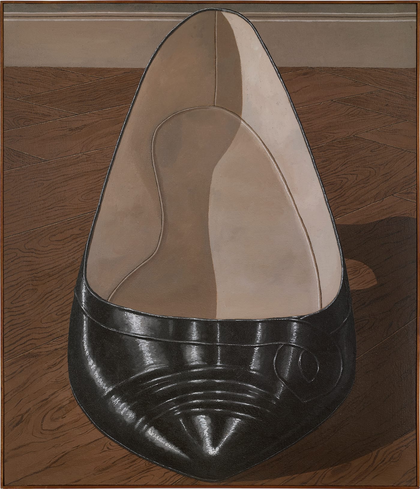 Sometimes, as in “Scarpa di Fronte” (1967), where the subject is a woman’s left shoe, unworn articles of clothing imply missing humans. And even when there is a human, as in “Capigliatura maschile” (1966), which depicts a male head from the weird, wormy eyebrows up to his precisely combed coif, the exacting perfection of the paint application implies a plastic artificiality and coldness that feels mortuarial or at least mannequin-like. Which brings us back to the momento mori nature of this work. The fashion Gnoli depicts does not seem from the ’60s. There is a whiff, not of nostalgia, which implies a yearning for a happier past, but the sad memory of a style already vanished, before the paintings were made, like the vision of a grandparent’s home. Loss and absence haunt this work.