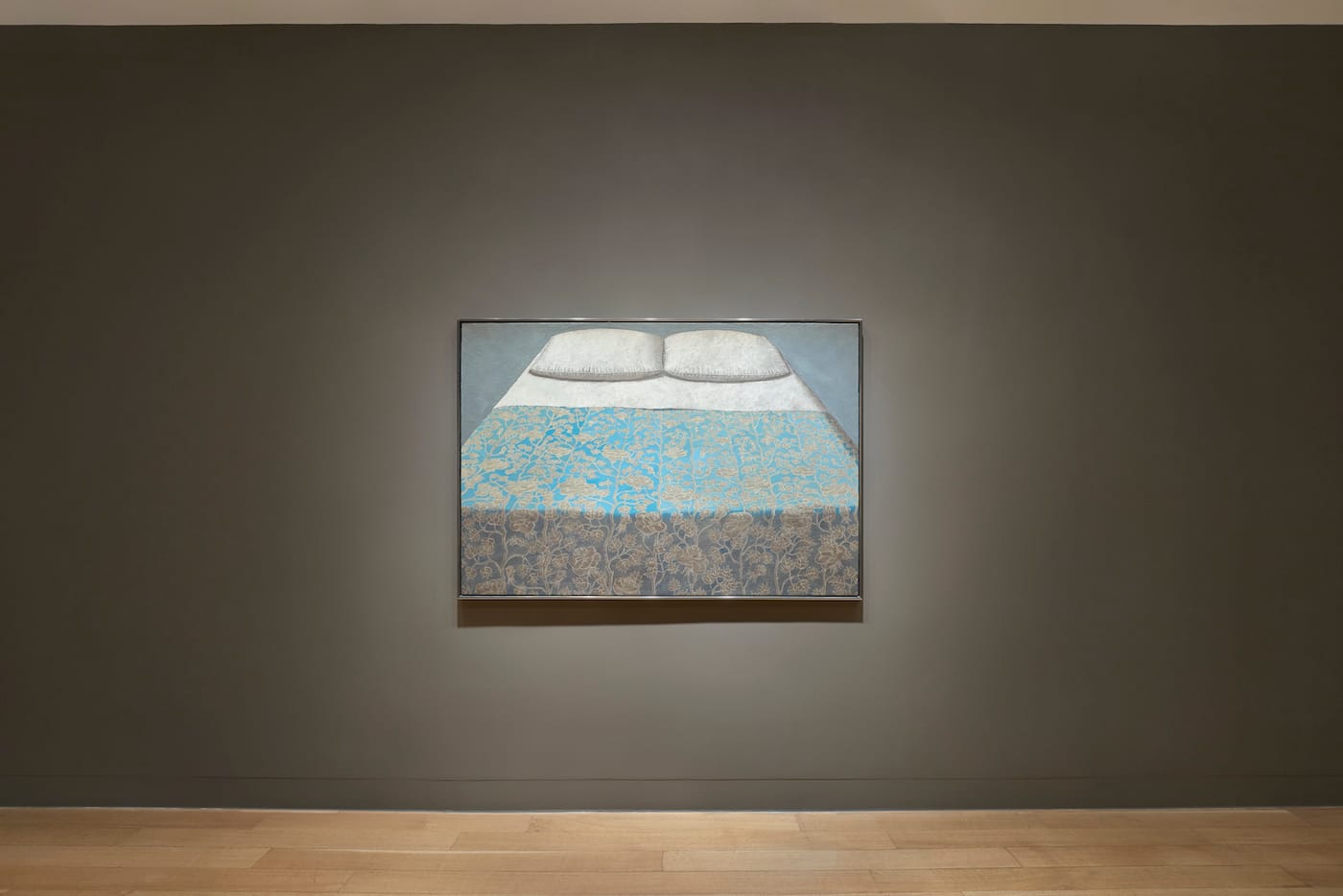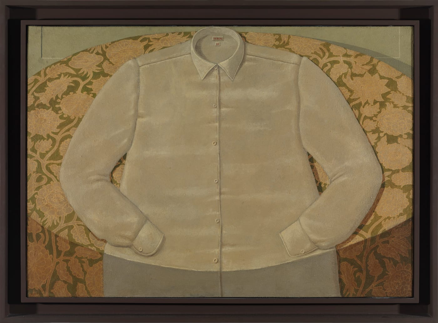 Undoubtedly in every art school class these days there’s a student painting close-up views of objects. (Gnoli certainly pointed the way for some renowned contemporary artists, like Catherine Murphy.) But despite the deceptive obviousness of its premise, Gnoli’s work continues to intrigue because the paintings are so full of contradictions. He managed to achieve his eerie intensity through subtle complexity with minimal means. While there is always a central object, the image itself is never truly symmetrical. First, the symmetry in almost all the paintings is broken with shadows produced by an unseen lateral light source (one of the many examples of absence in his work). He also almost always employs some kind of irregular patterning. Looking at the patterns on the seat in “Chair” (1969), the tablecloth under the shirt in “Chemise Sur la Table n.3” (1967), and the not-quite-identical pillows in “Sofa” (1968), you will notice that forms are not congruently repeated, though it feels that they are. This subtle, unexpected irregularity is one of the secrets to why these paintings always feel subliminally and disturbingly disjunctive: quiet, yet with an undercurrent of animation; ploddingly realistic yet full of imaginative invention.