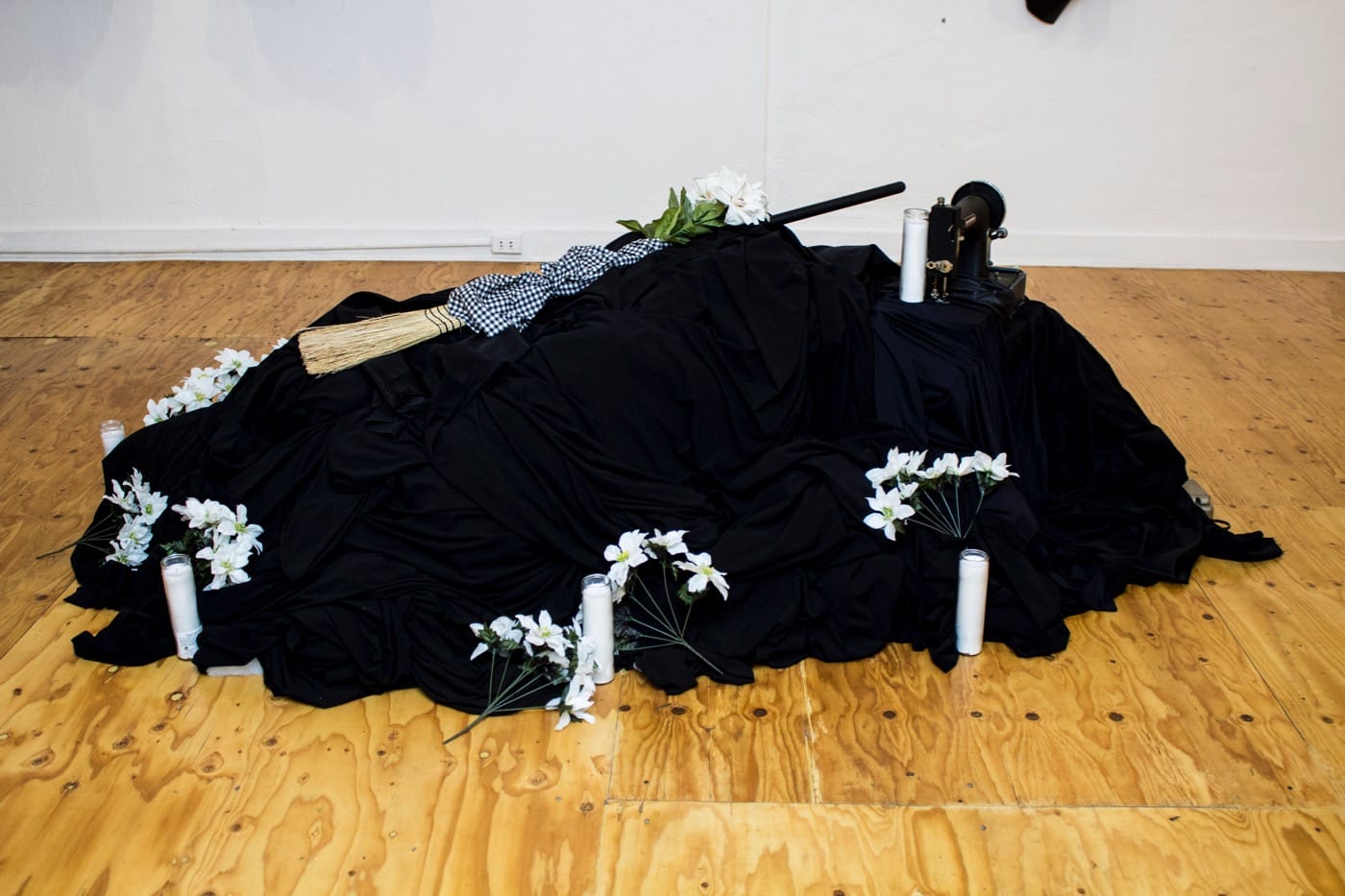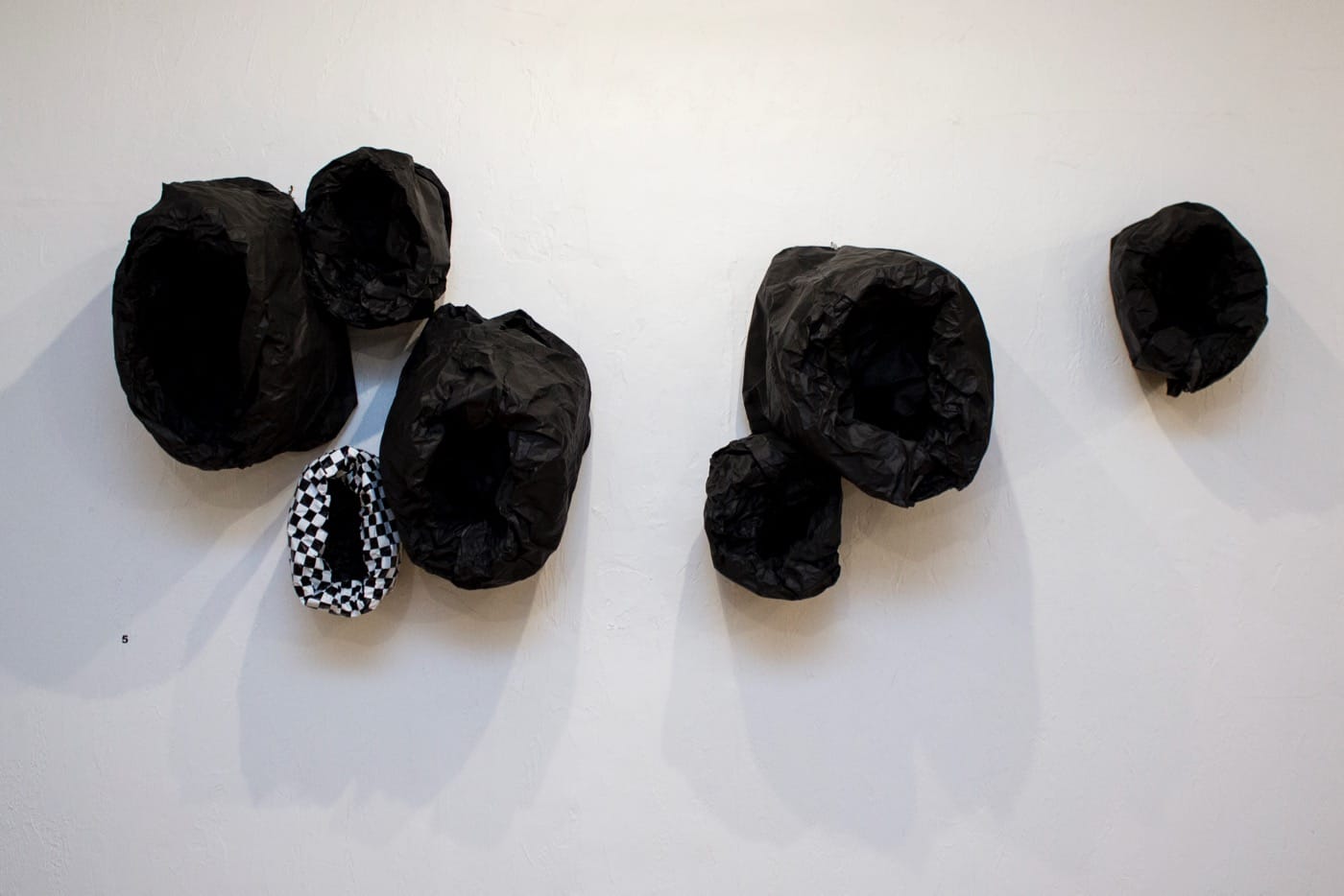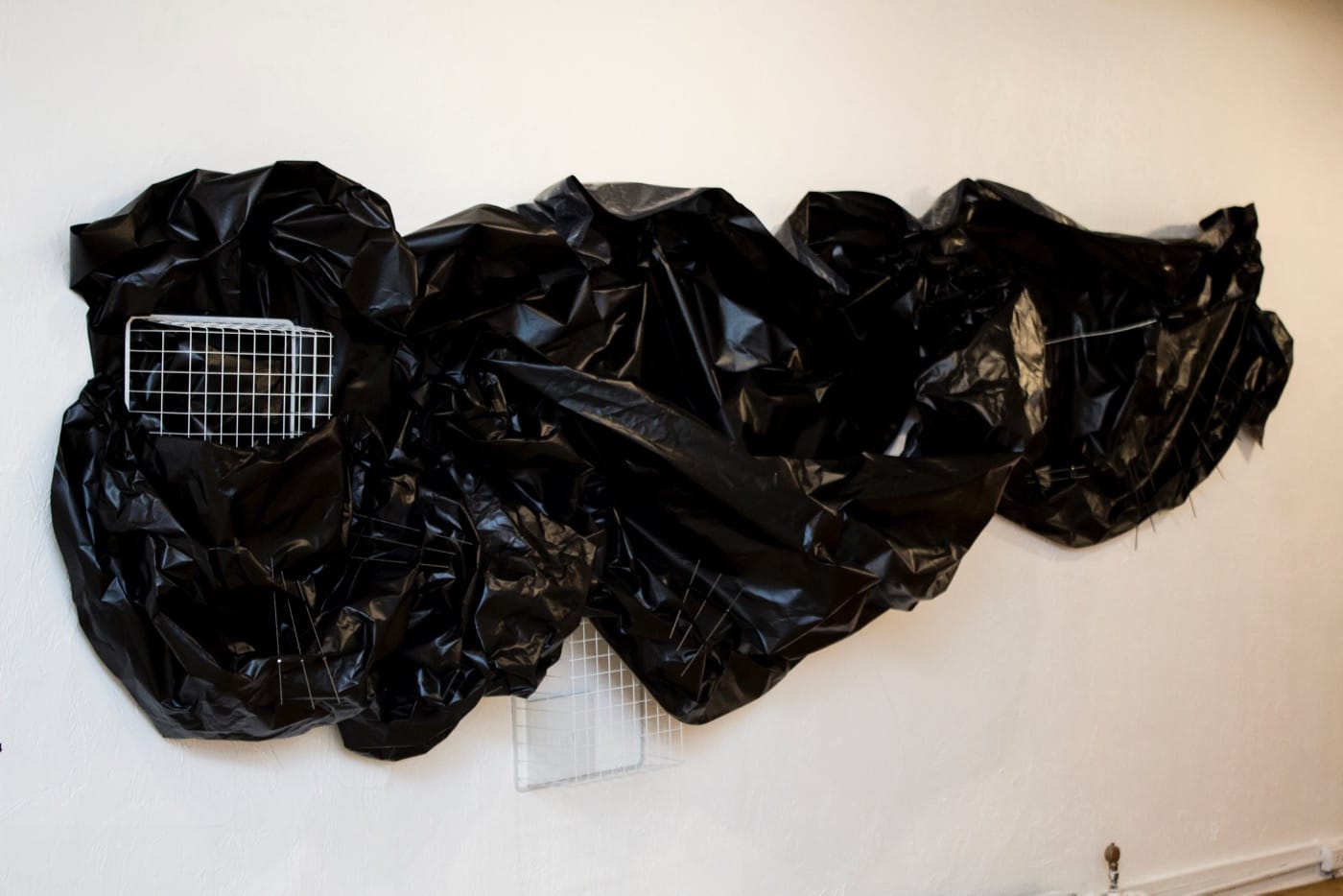 I think of this idea of whiteness being an attitude, a world view, a kind of glamour, that is to say enchantment, because Duroseau’s show is so much the antipode: the title alone tells us that the artist is focusing on things. When I visited the gallery and spoke to Duroseau about the show, querying the many material things I saw that invoked corporeality — particularly the mannequins that looked like they had gone through a process of “negrofication” such as “A Woman is Still a Woman, If She’s a Woman” (2017) — she addressed this contradistinction. She said that so many artworks she saw, particularly those made by white men ensconced in art historical canons, “were about nothing,” and thus she wanted to use a similar material idiom to “talk about something.” Given this conviction, the viewer gets pieces like “Does My Presence Offend” (2017), which consists of a large, dark cloth scrunched and folded on a wall with intermittent visible metal struts piercing the material to hold it up. A similar work is “The Identity You Prefer” (2017), which consists of garbage bags held horizontally against the wall almost at eye level, tempting me to place my face inside to see what might be hidden in their recesses.