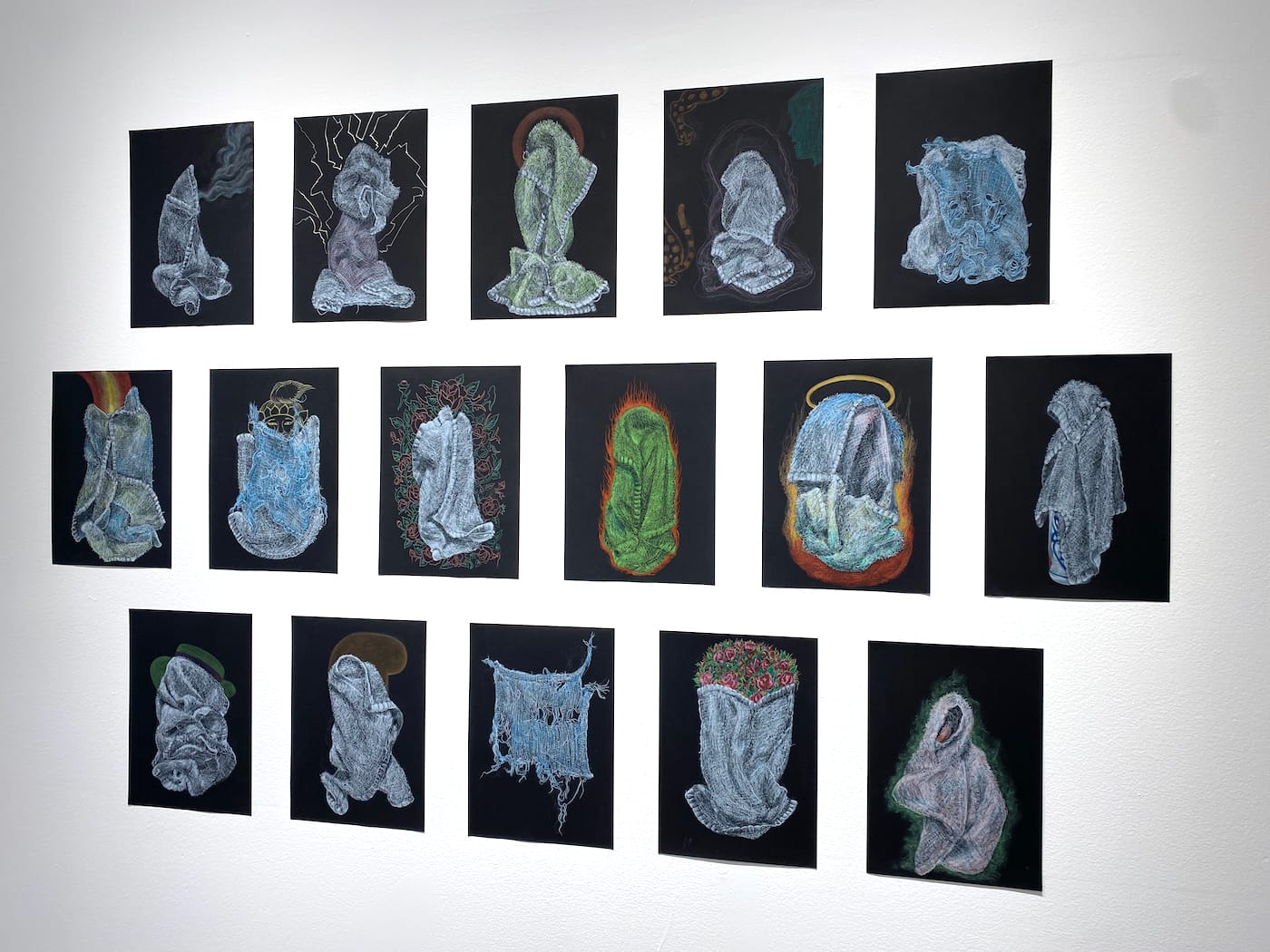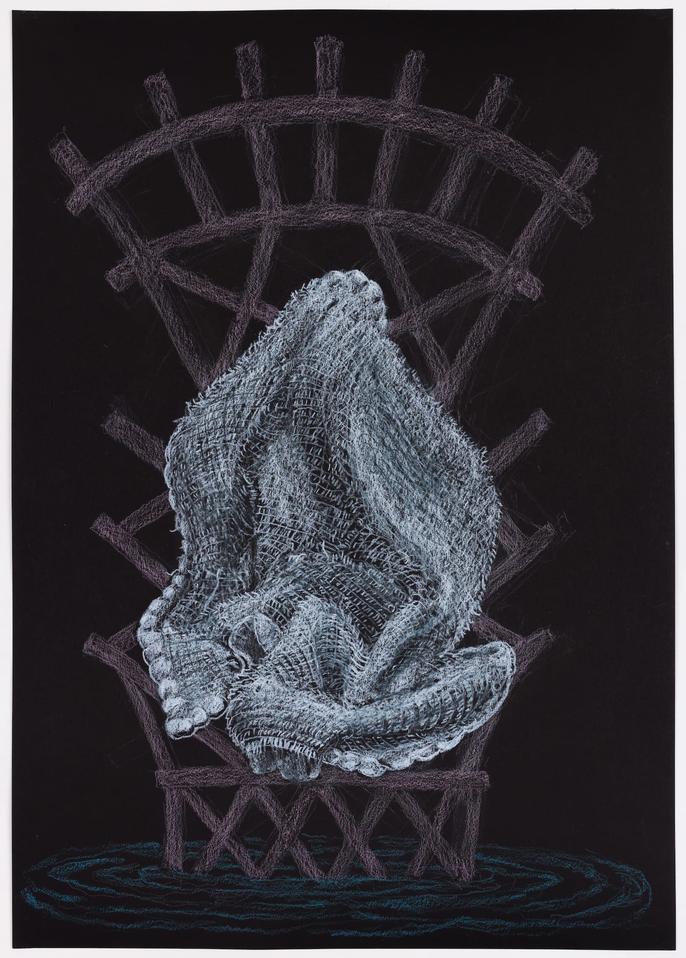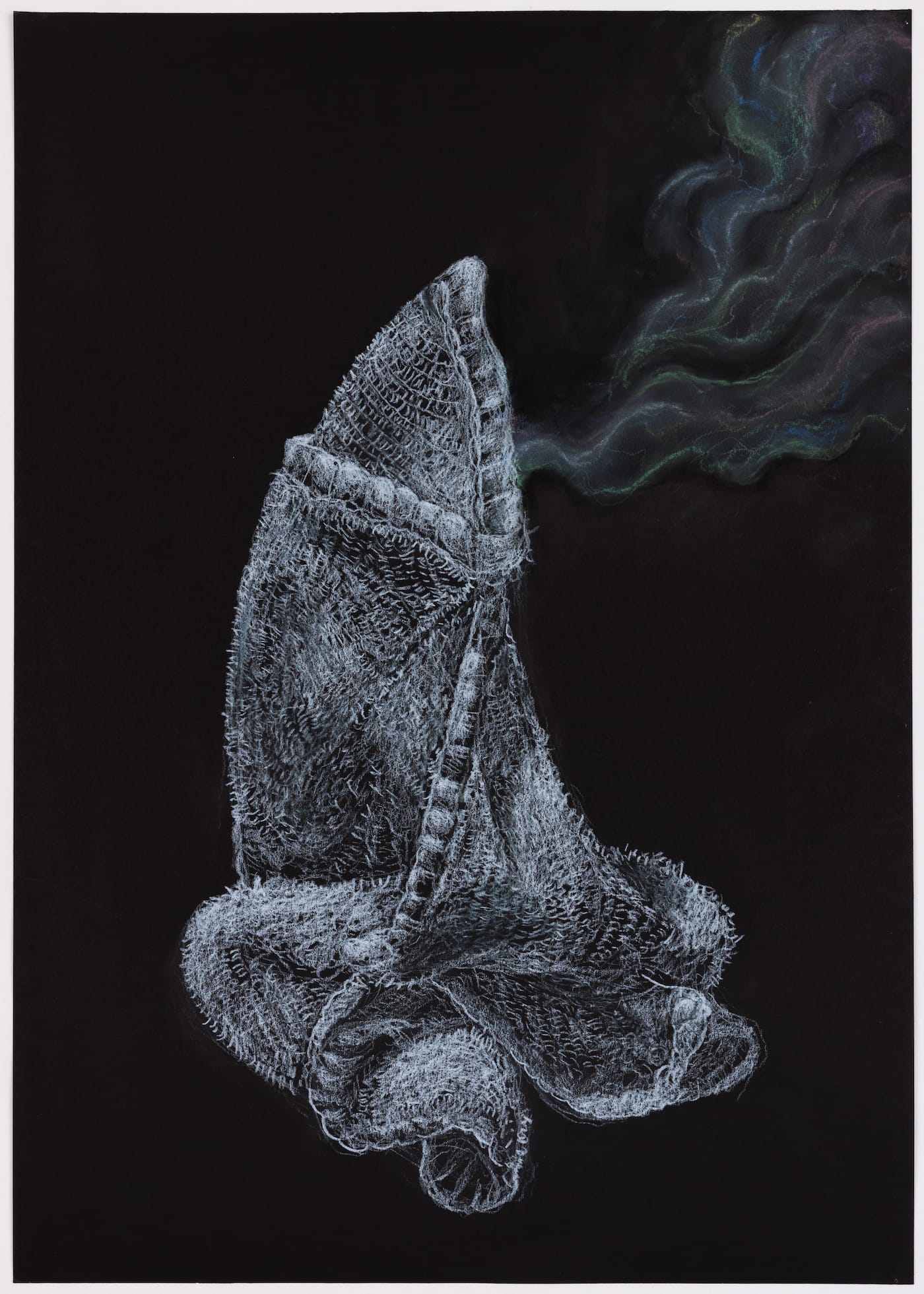 The rag series began simply enough when Hardy’s wife, Francesca, dumped a pile of cleaning rags onto a table. “I said, ‘that's a pretty good shape, I should draw that thing,’” he recalls. He renders each rag through fine skeins of colored lines on black paper, endowing them with the dramatic presence of Renaissance drapery. They also resemble the linework of etching or engraving, evoking his student days as a printmaker. He adds elements of tattoo flash, such as a flame or a panther, into parts of the composition. In addition, he incorporates a lattice pattern to which he has returned over the years; the pattern is a reference to the trellises of his childhood backyard.