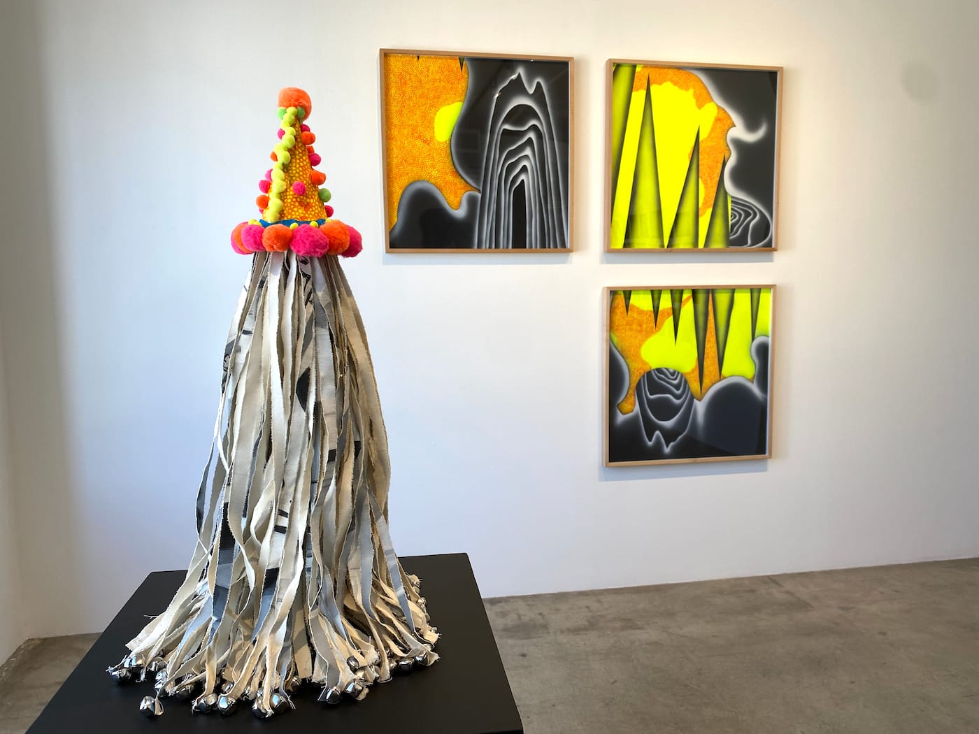 “Spirit Painting No. 1” (2022), a sculpture composed of strips of an old painting fashioned into a cone, speaks to the transformative and expansive conception of art that she shares with Hardy. Decorated with bells and pom-poms, it refers to the costumes worn by the Hopi dancers Steelink witnessed at a performance her parents took her to as a child. “I crawled under the table and I hid because I was so afraid of those dancers, because they were beings,” she recalls. “This is the purpose, right? For them to extend beyond the human by having these costumes. They become these spirits, performing for the purpose of harvest, rain, or whatever is necessary for life.”