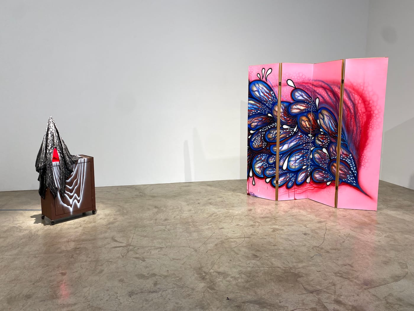 At Track 16, she digs into her personal and artistic history, cutting up old paintings and reassembling them into, for instance, a folding screen, as with “A Haunting (Blood Language)” (2022/2011), a carnally suggestive blue and pink abstraction sliced into four panels. “Sustained by a Myth (a recurring childhood nightmare)” (2022) features a plaster model of a cave with a sinister red glow emanating from its mouth, perhaps an attempt to exorcize a disturbing childhood dream by recreating it.