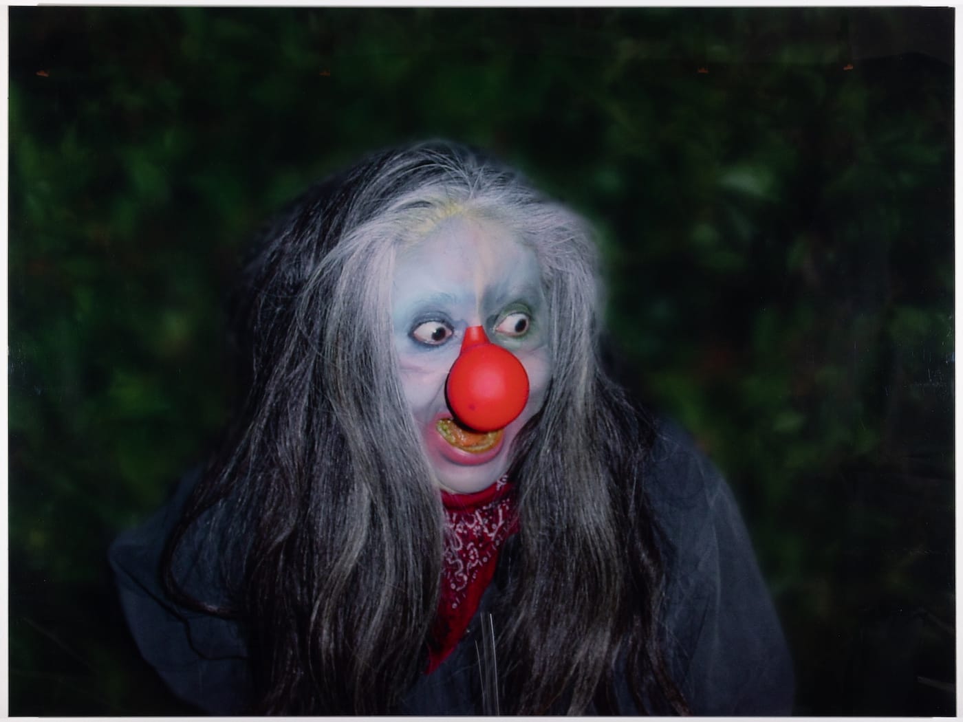 She is referring to the delicate line drawings of crumpled, threadbare rags by Don Ed Hardy that make up half of the two-person exhibition Evidence of Things Unseen at Track 16 Gallery, near downtown Los Angeles. The other half features work by Steelink, a motley assortment of vibrant paintings, sculptures, and photography that is as exuberant and brash as the rag drawings are precise and measured: the clown-like foil to Hardy’s straight man. The photograph “Deliverance (Trickster)” (2000), from the Rodeo Clown series, portrays Steelink as a white-faced clown with a bulbous red nose, eyes bulging and mouth agape, a terrifyingly comic self-portrait.