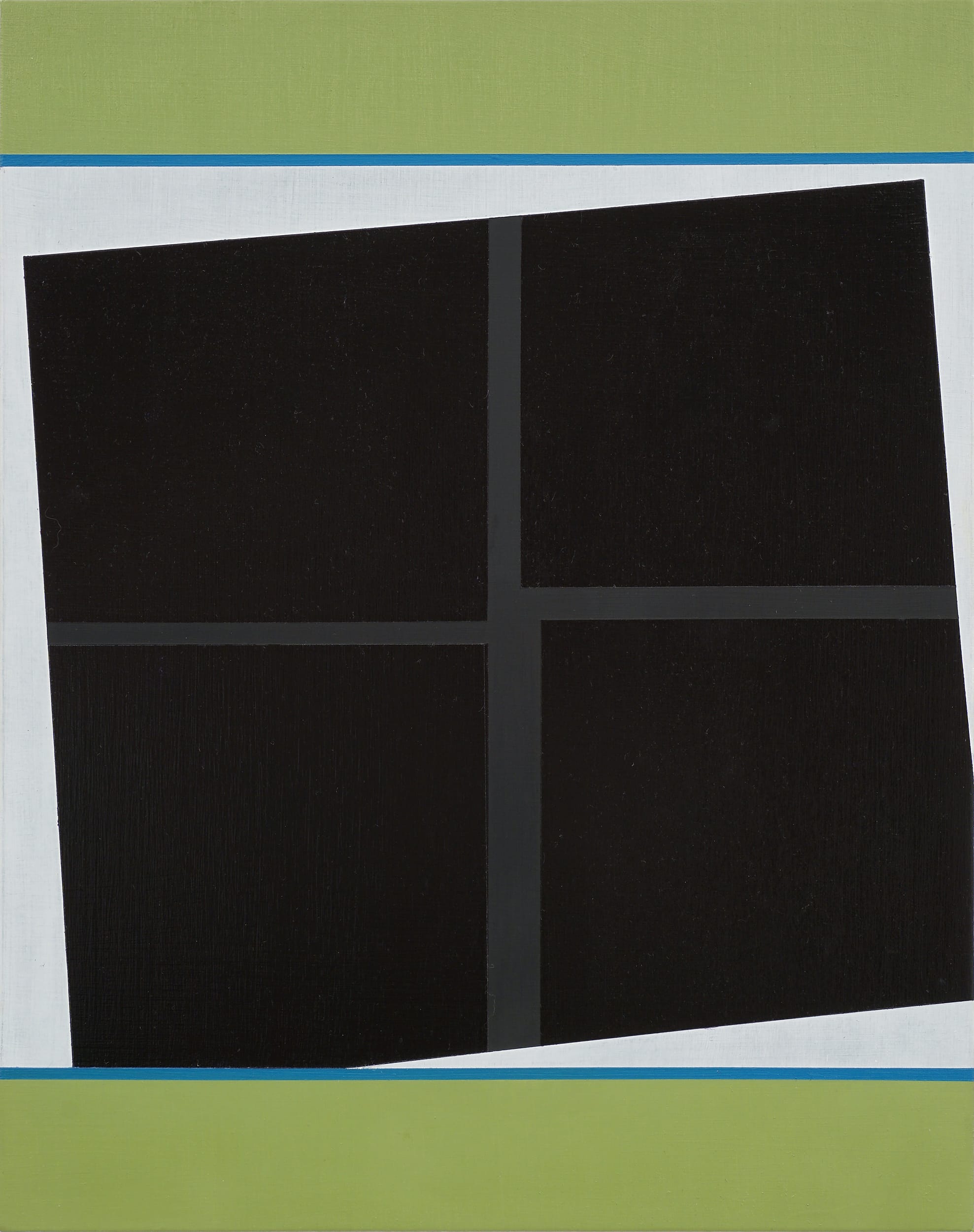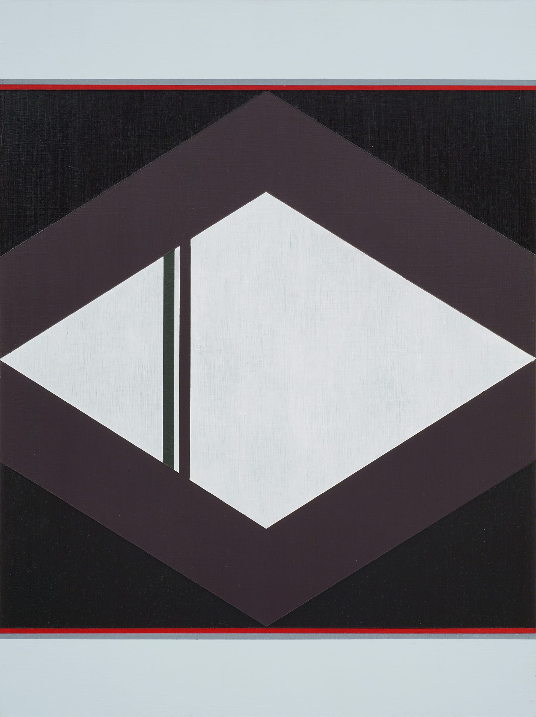 By the time I reviewed Don Voisine’s work in 2013, he was a veteran painter of geometric abstractions who was working with a hard-edged vocabulary and compositional format that centered a black form (rectangles, triangles, parallelograms, and trapezoids). Looking back through his work, I learned that in 1992 he began surrounding the black form with a border. In 1999, he introduced the diagonal into his work, adding another layer of tension between containment and expansion. Since then, he has expanded upon these possibilities while remaining devoted to his use of a single or double overlaid black form, hemmed in by parallel rectangles pressing in from either the painting’s sides or the top and bottom.