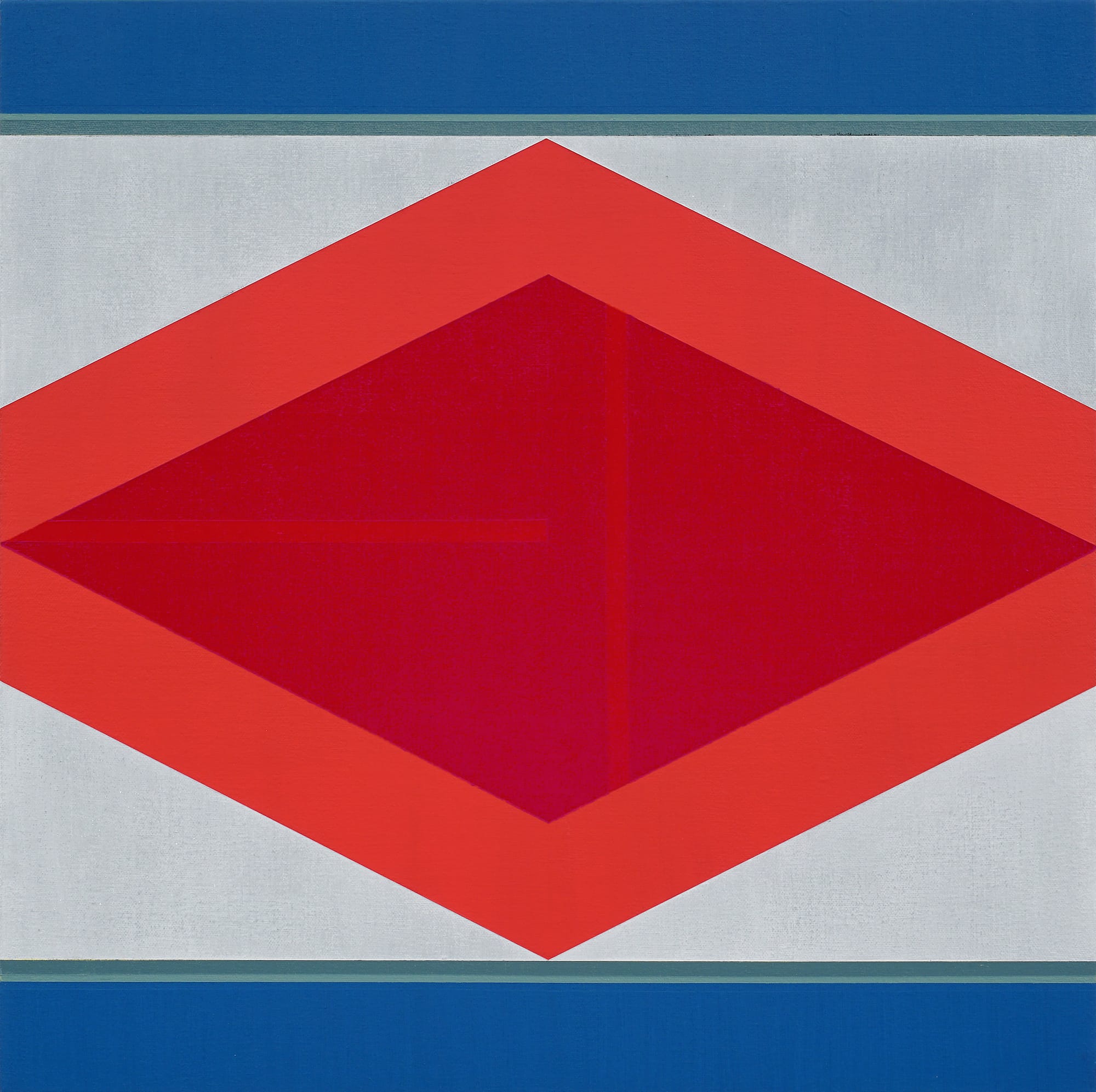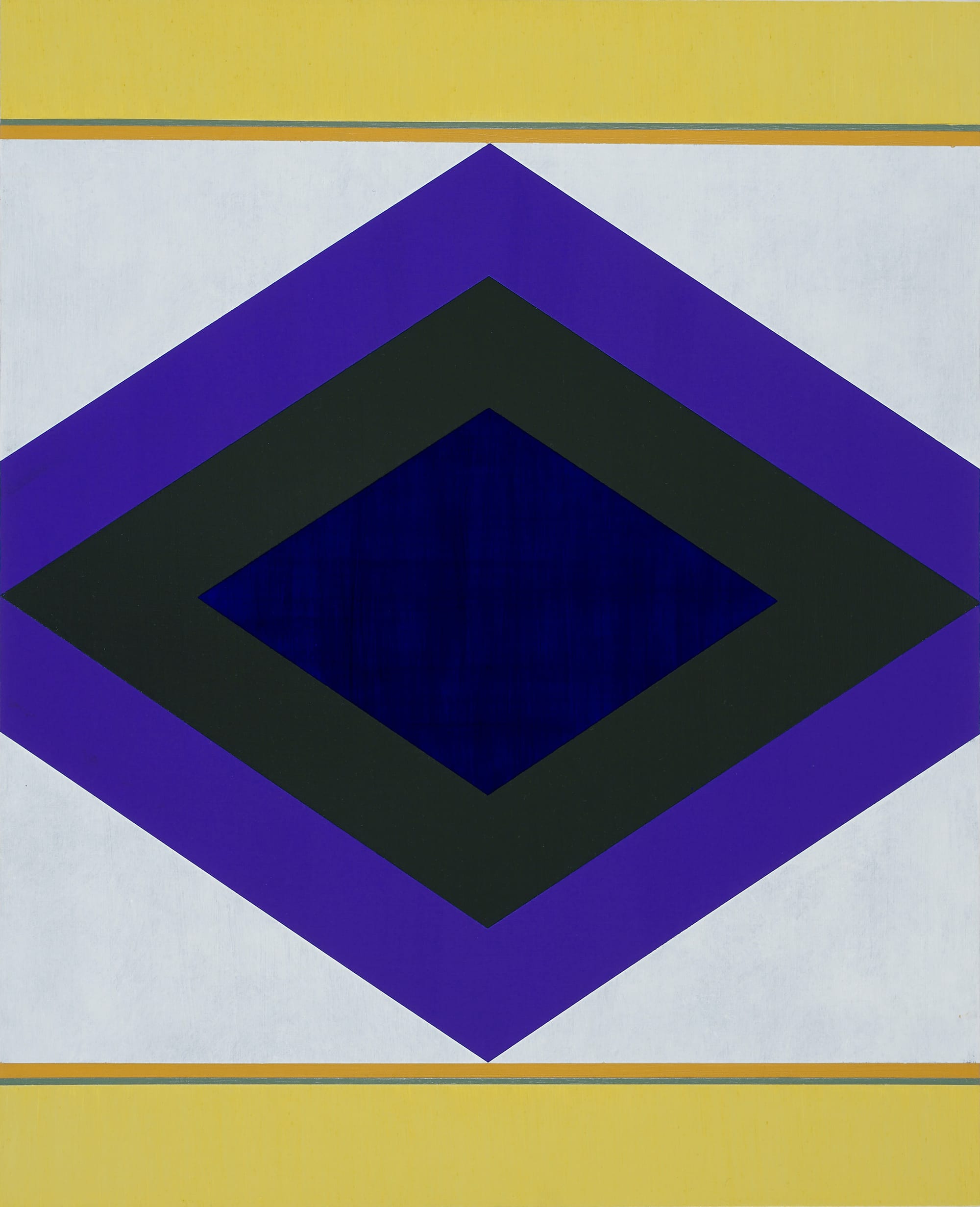 In eight of the paintings, Voisine incorporated diamond shapes, in which he nested one or more small diamonds within larger ones. Because the larger ones are cropped by the painting’s sides, underscoring the two-dimensional surface, the smaller inset diamonds perceptually flip between pressing against the surface and tilting back in an indeterminate space. That shift between flatness and shape enables our eye to move into the painting, to sense a space that eventually hugs the surface, pushing us out. This optical tension speaks to one of painting’s issues: How can a painting be an autonomous object if a viewer is necessary to complete it? Another new element in the works is an irregular cruciform. The diamond and cruciform shapes achieve different things.