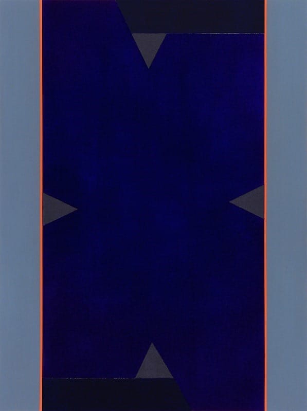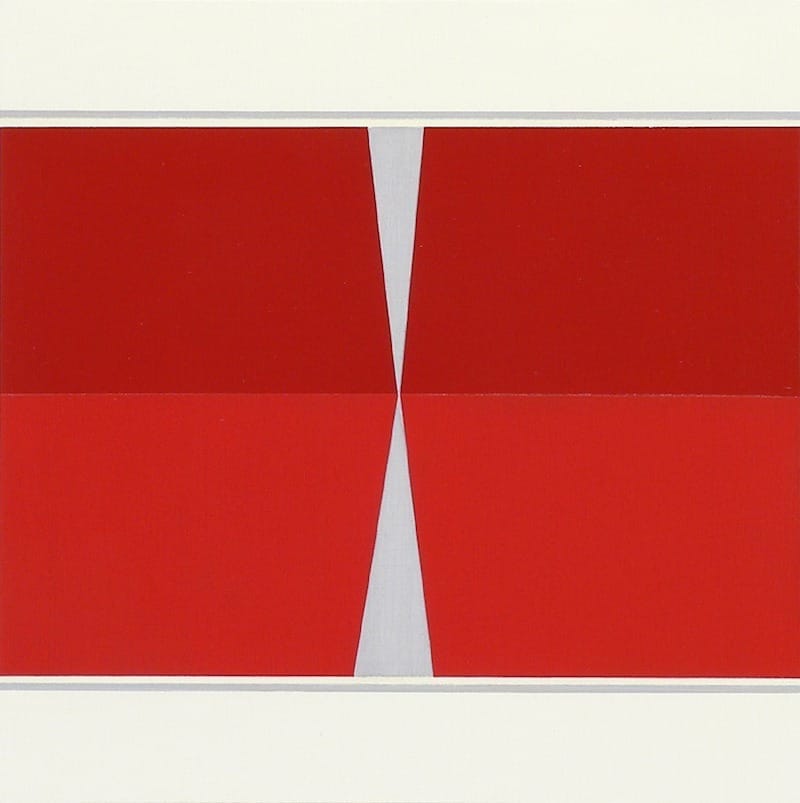 Every color in a Voisine painting has its own material identity. Even the narrow bands edging or running through the panel’s border colors convey a distinctive feel to their physicality. The shifts between the sectioned areas can be tonal or sharp, but the vocabulary is solidly geometric: trapezoids, parallelograms, triangles, rectangles, and squares. The angled planes add a torque to the compositions. It is as if everything is held in a state of suspension, with the actions of falling, slipping, and sliding implied.