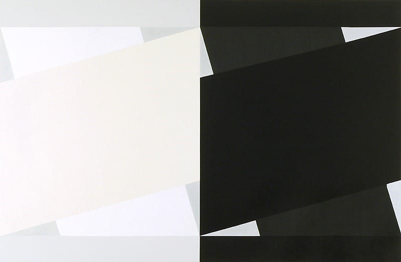 There are seventeen paintings in the exhibition Don Voisine at McKenzie Fine Art (May 5 – June 18, 2017). They are done on panels, which have been cut into squares and rectangles, vertically or horizontally aligned. There is a diptych with each panel the same height but a different width. The narrow space between them adds another tension into our experience. The smallest painting measures 12 x 12 inches, while the largest is 53 x 80 inches and one of his best. Within his circumscribed vocabulary of geometric forms, Voisine never repeats himself. The shift in scale quietly underscores our need to pay attention.