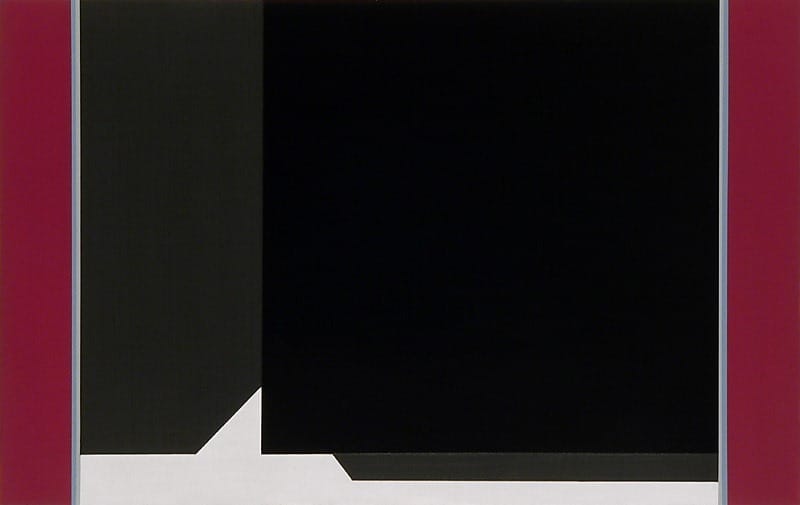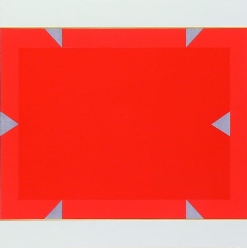 These are the pleasures these paintings offer the viewer who cares to think about how complicated the everyday act of looking actually is, who is able to slow down long enough to pay attention to things as real as surface, color, density, and space. The tension between the painting-as-container and the planar forms wedged, as well as layered, into it, is exquisitely tuned. I am reminded of a cinematographer’s attention to dramatic, often erotic moments occurring within closely focused areas: the slip of air hovering between lips that are about to meet, or having just parted. The two different shades of deep red in “Parting” (2017), along with its glossy surfaces and carefully applied coats of paint, and the tips of the bisected pentagons about to meet, brought such a cinematic scene immediately to mind.