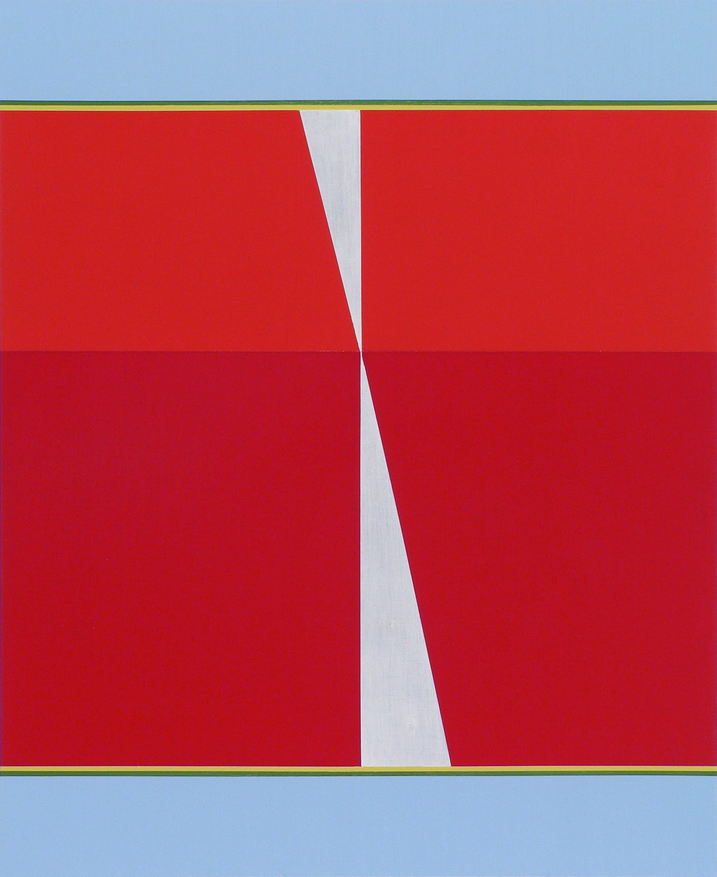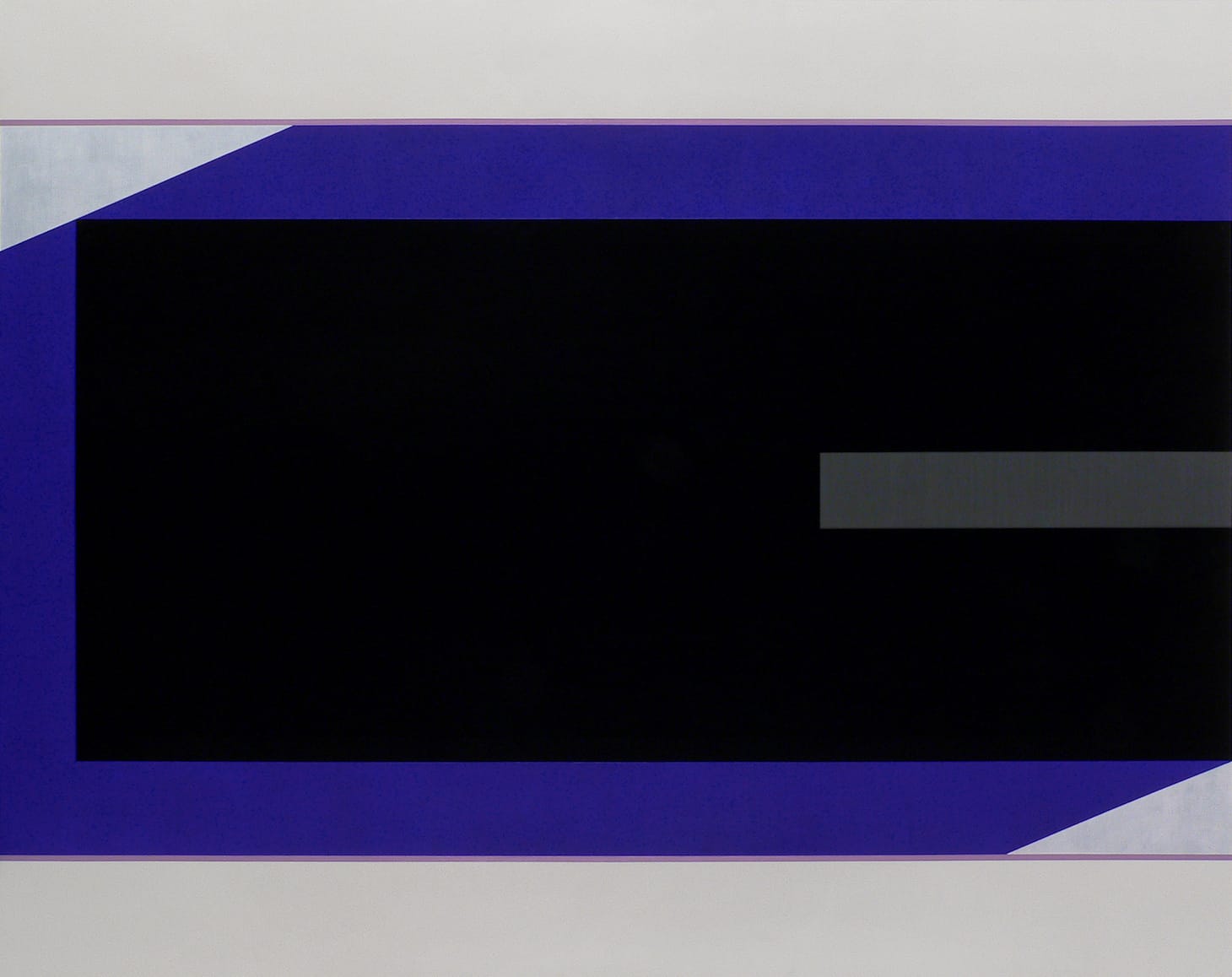 Since 1992, when Voisine first began painting a centered black form surrounded by a border, he has pushed slowly and deliberately against these self-defined constrictions without ever completely letting go of them. In 1999, he added a diagonal into his compositions, making spatiality a component of his work. Further changes include making the centered black form a saturated red or electric blue. His use of concentrated colors, whether for this centered form, the narrow bands between the outer borders and inner form, or the outer borders, focuses our attention on the different contrasts, shifts, and pressure points happening throughout the painting.
