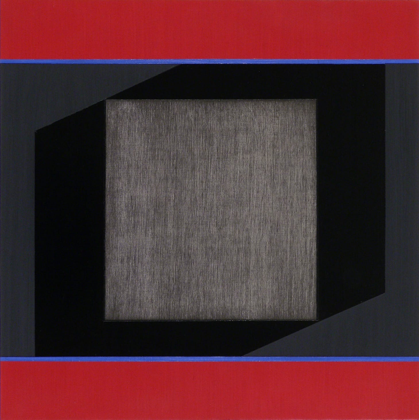 There are three different material manifestations of black in the painting: the shiny black rectangle; the matte black areas on either side of the hexagon and extending to the painting’s right and left edges; and the rubbed-down square, which adds a note of melancholy to the painting. It seems to me that the opticality of the blue strip against the red band works in contrast to the tonal shifts caused by the three interdependent blacks, with each grouping enhancing the other.