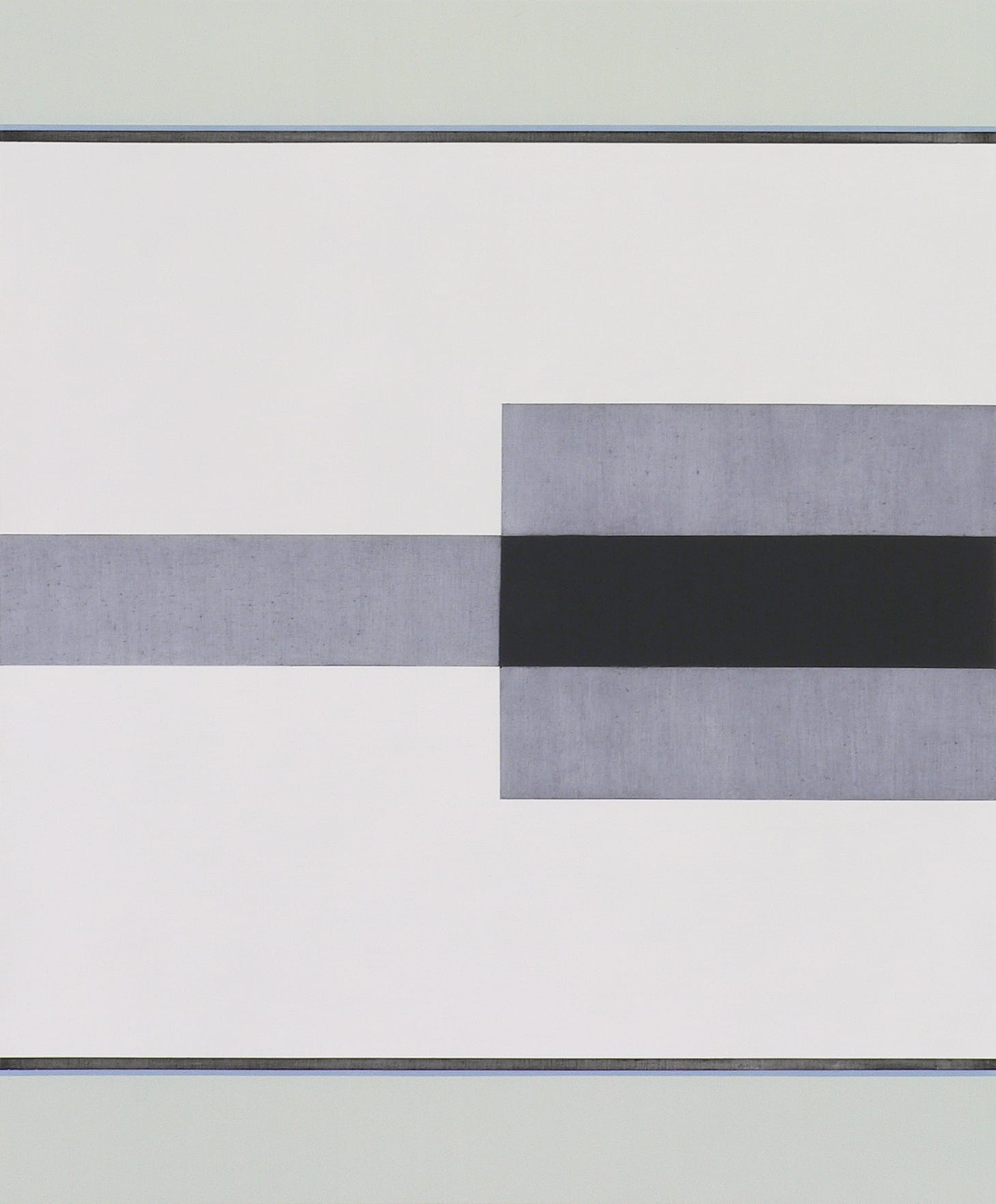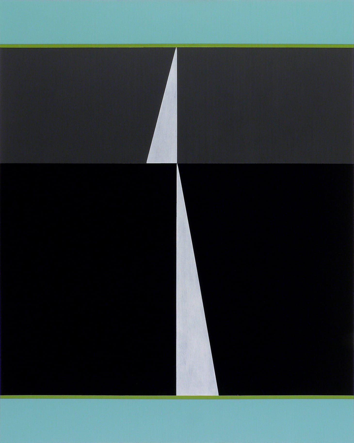 In “Strike Twice,” Voisine stacks two different-sized rectangles within a vertical format measuring 30 by 24 inches. As with “Center Square," a border, here consisting of a narrow green strip and a thick turquoise strip, is above and below the two black grounds. On these grounds, Voisine has painted two white triangles. For all their similarity, each triangle is unique and separate from the other.